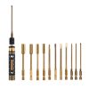 This comprehensive 12-piece tool kit is designed for RC model enthusiasts, providing a range of hexagonal wrenches and screwdrivers. The set includes hex screwdrivers in sizes 1.5mm, 2.0mm, 2.5mm, and 3.0mm, along with nut drivers in 4.0mm, 5.5mm, 7.0mm, and 8.0mm. Additionally, the kit features box Phillips screwdrivers in 4.0mm and 5.0mm, as well as slotted screwdrivers in the same sizes. Crafted in a striking gold and black finish, these tools are wear-resistant and anti-rust, ensuring durability and a long service life.
