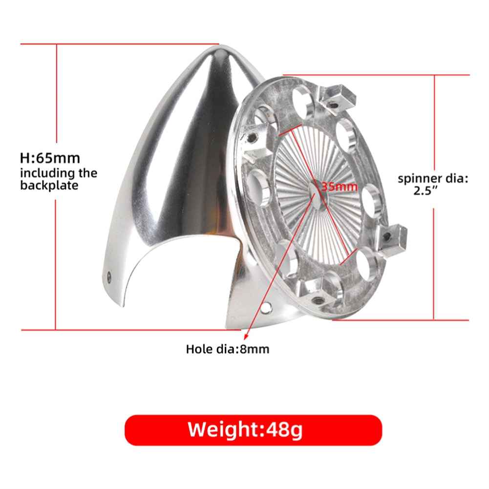 This 2.5-inch aluminum alloy propeller spinner is designed for RC airplanes, offering a durable and lightweight solution for your model aircraft needs. With a height of 65mm, including the backplate, and a spinner diameter of 2.5 inches, it ensures optimal performance. The hole diameter is 8mm, providing compatibility with various RC airplane models. Weighing just 48g, this propeller spinner is crafted from high-quality aluminum alloy, ensuring longevity and reliability during flights.