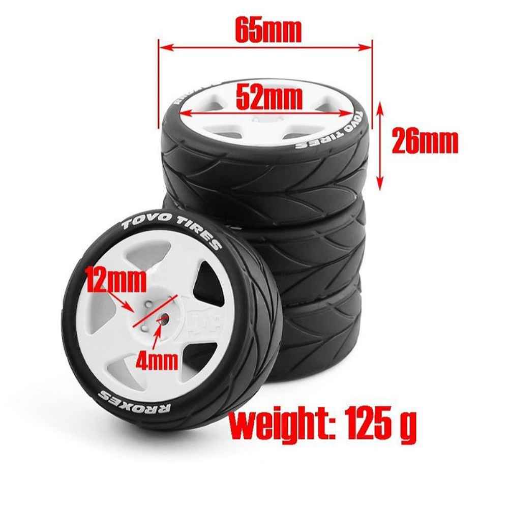 Upgrade your 1/10 scale RC car with these high-performance rally drift on-road tires and wheels. Crafted from durable plastic and rubber, they feature a 12mm hex adapter for easy compatibility with HPI, KYOSHO, and TAMIYA TT02 models. The tire’s outer diameter measures 65mm, while the rim diameter is 52mm, and the tire width is 26mm, ensuring a perfect fit for your RC vehicle. Weighing approximately 125g, these tires provide excellent traction and stability for enhanced performance during your racing adventures.