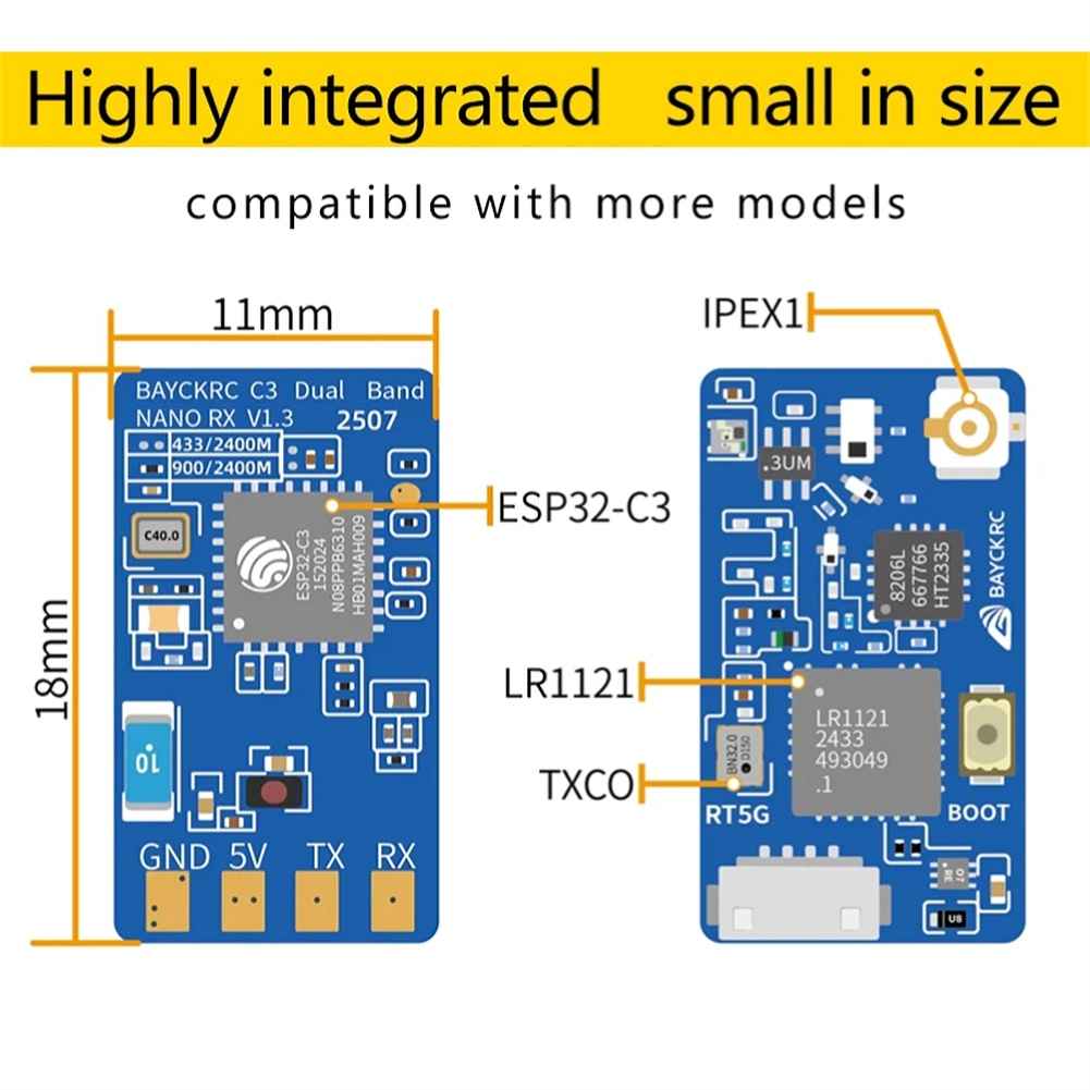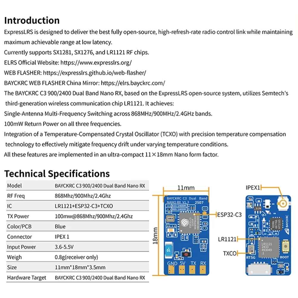 BAYCKRC C3 900/2400 Dual Band Nano RX is based on the ExpressLRS open source system and uses Semtech’s third-generation wireless communication chip LR1121, which realizes single-antenna 868Mhz/900Mhz/2.4Ghz frequency switching and 100mw return power at three frequencies. We also use a temperature compensated crystal oscillator (TCXO) through precise temperature compensation technology to effectively solve the frequency drift problem of the crystal oscillator under different temperature conditions, and achieve these on the 11*18mm small volume nano.