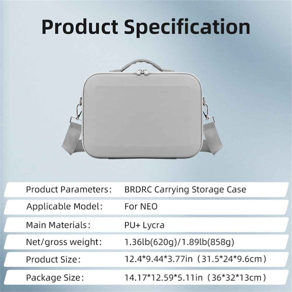 The BRDRC Portable Waterproof Storage Bag is designed specifically for the DJI NEO RC Drone. With a sturdy hard shell and shock-absorbing Lycra fabric lining, this bag offers excellent protection against impacts. Its high-quality PU leather construction is both waterproof and scratch-proof, ensuring durability and easy maintenance. The adjustable shoulder strap allows for versatile carrying options, making it convenient for travel. The bag features a custom-fit interior to securely hold your drone and accessories, while the exclusive hole position design minimizes external force impact. Choose between black or grey to match your style. Note: The drone and accessories shown are not included.