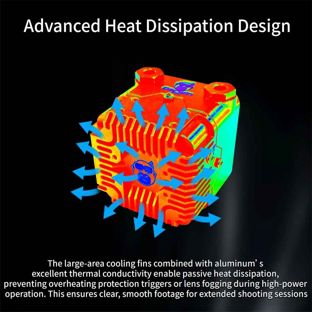 Large aluminum heatsink: Prevents overheating and lens fogging