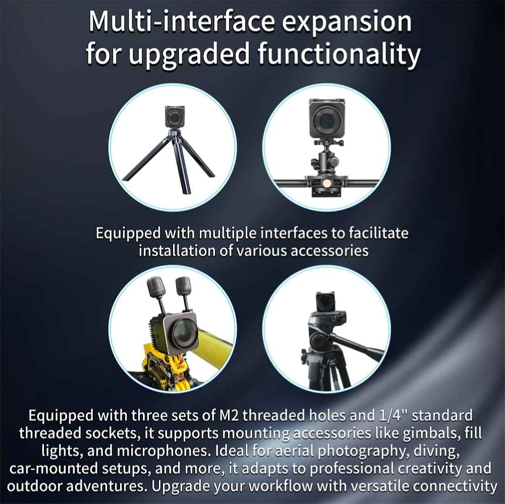 3x M2 threads + 1/4′ sockets: Attach mics, lights, or gimbals