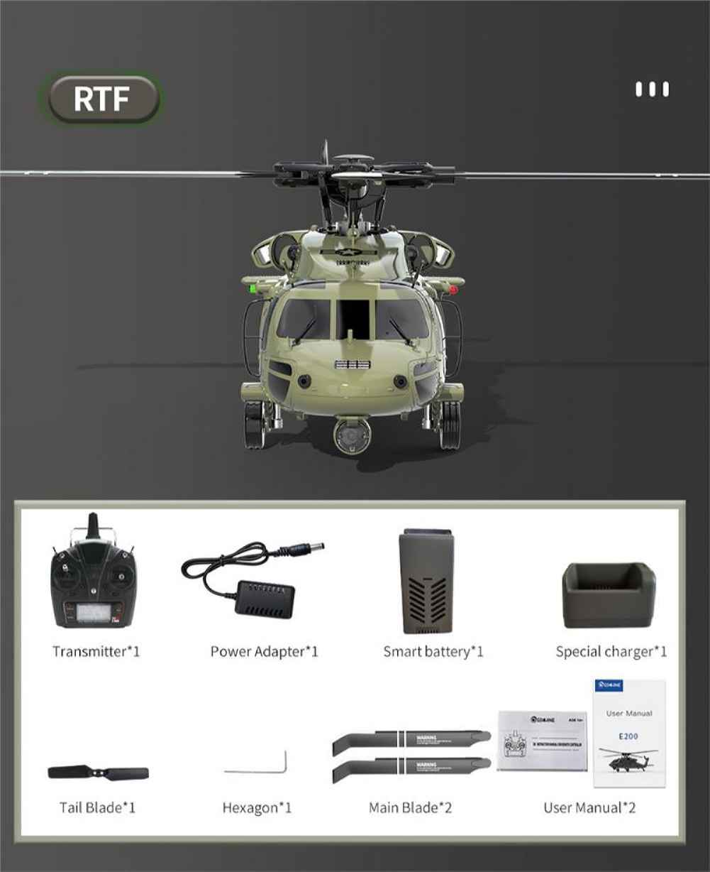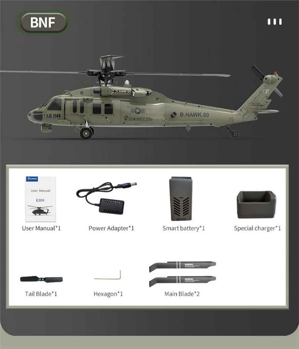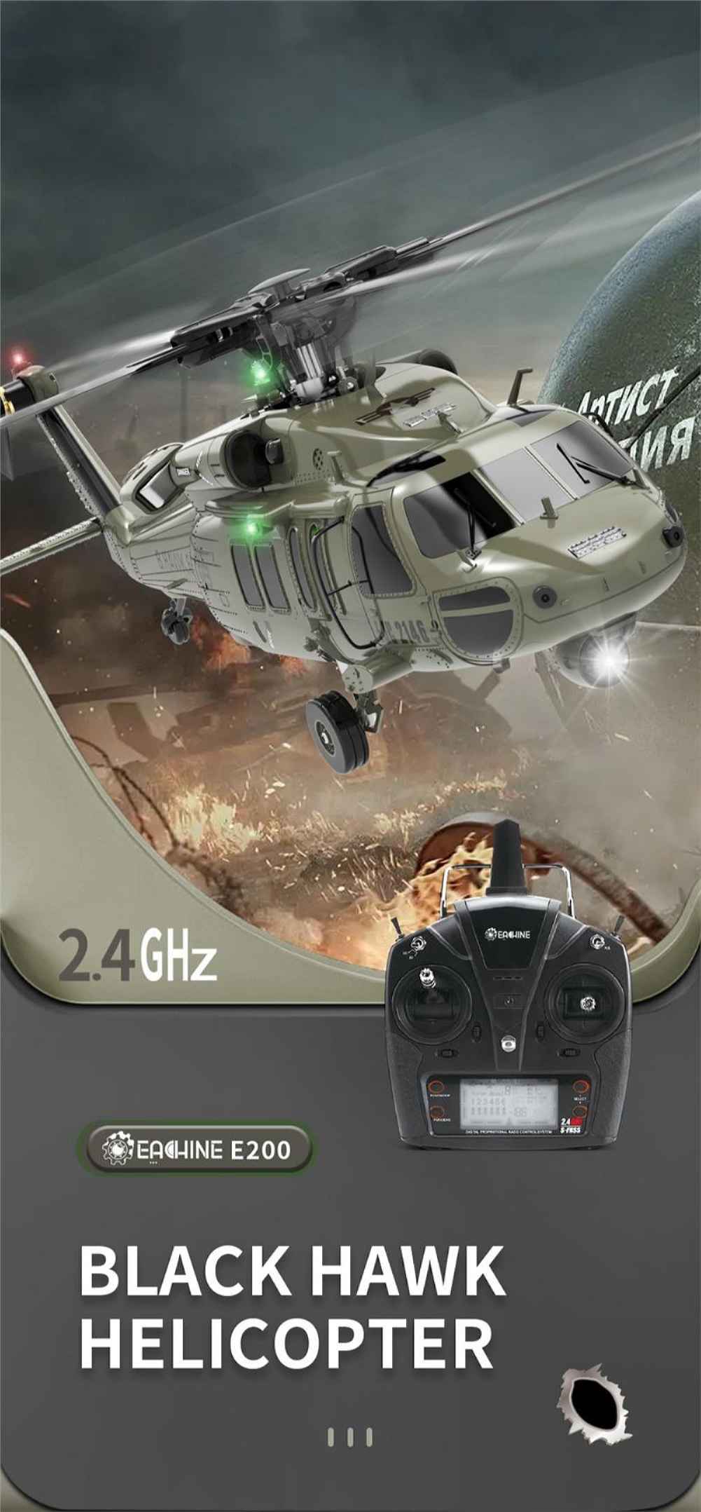 The Eachine E200S UH-60 is a high-simulation RC helicopter, scaled down to a 1:47 ratio of the U.S. UH-60 Black Hawk. It features a dual brushless motor with a flybarless design and a 6-axis gyroscope for precise control and stable flight, making it ideal for beginners. The helicopter is equipped with a high-efficiency four-blade tail rotor and a 2.4GHz remote control system, offering a range of over 120 meters. With a durable construction of nylon and carbon fiber composite materials, it is both robust and lightweight. The helicopter includes a 11.1V 1450mAh Li-Poly battery, providing 9-12 minutes of flight time, and a dedicated charger for efficient charging.