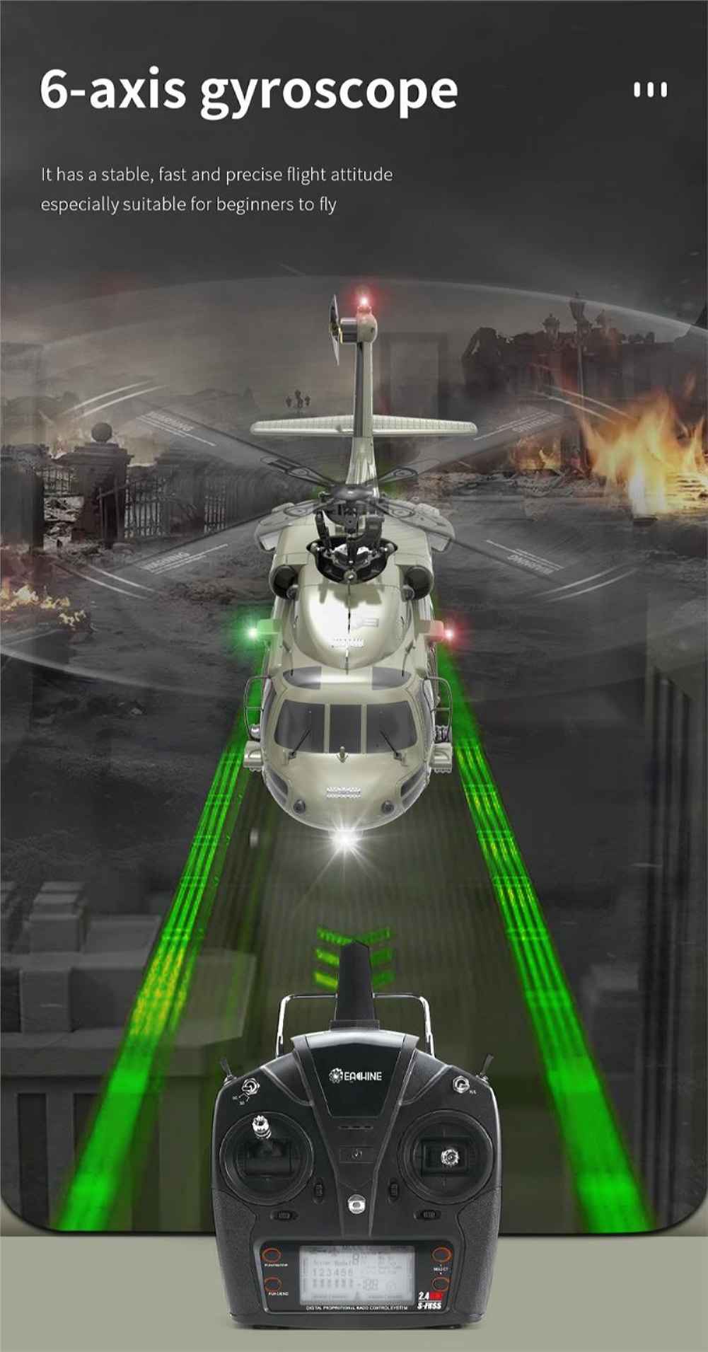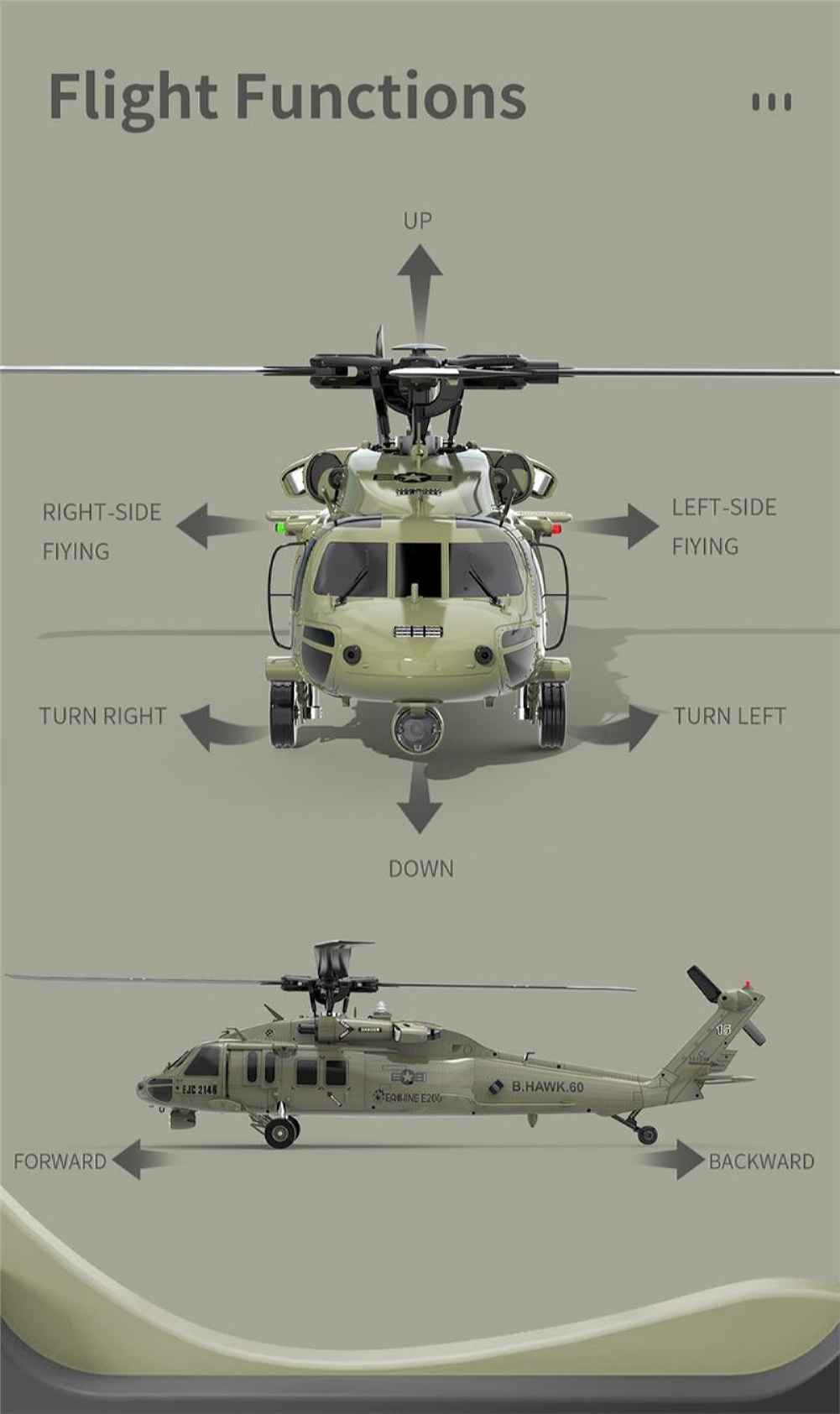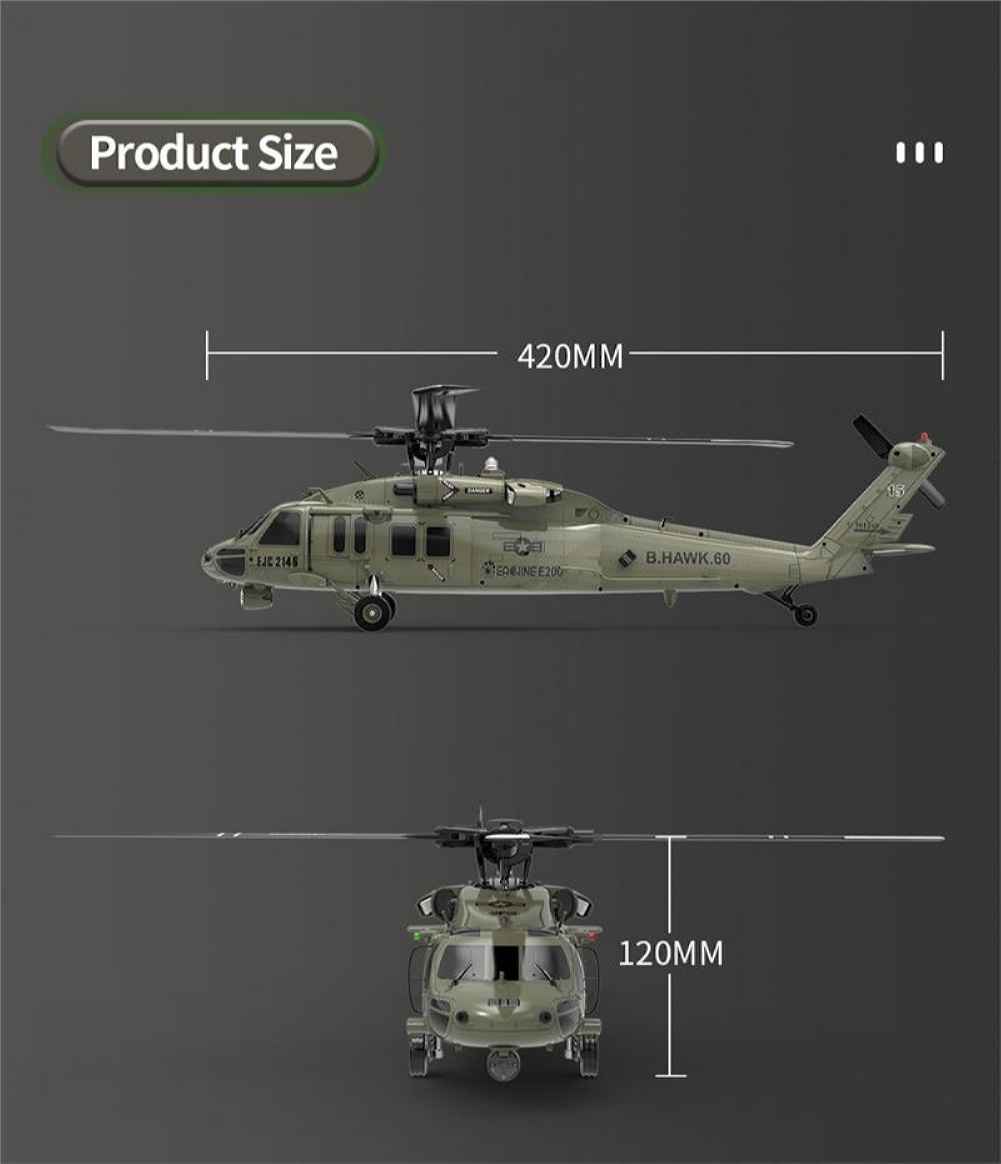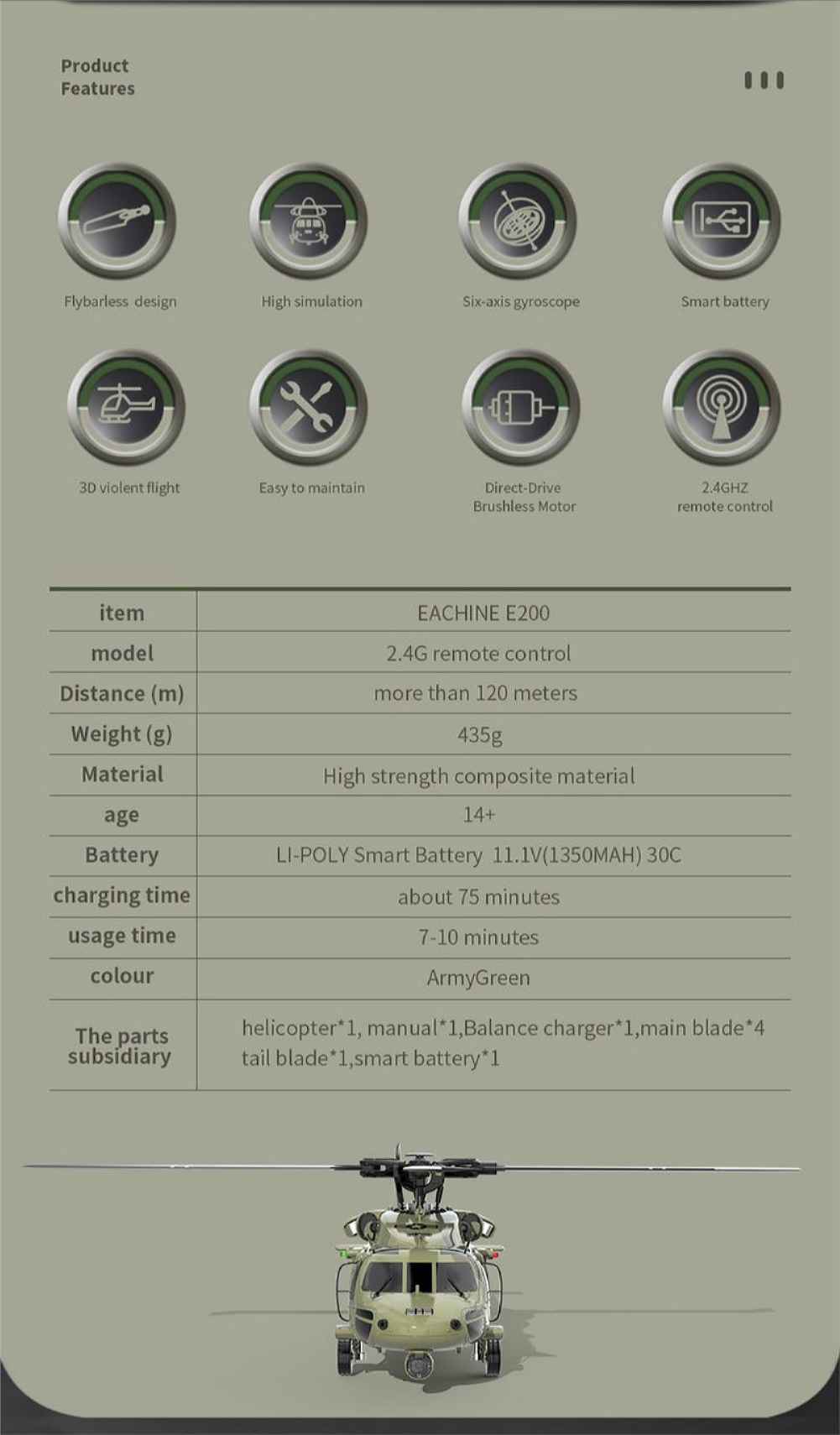 The Eachine E200S UH-60 is a high-simulation RC helicopter, scaled down to a 1:47 ratio of the U.S. UH-60 Black Hawk. It features a dual brushless motor with a flybarless design and a 6-axis gyroscope for precise control and stable flight, making it ideal for beginners. The helicopter is equipped with a high-efficiency four-blade tail rotor and a 2.4GHz remote control system, offering a range of over 120 meters. With a durable construction of nylon and carbon fiber composite materials, it is both robust and lightweight. The helicopter includes a 11.1V 1450mAh Li-Poly battery, providing 9-12 minutes of flight time, and a dedicated charger for efficient charging.