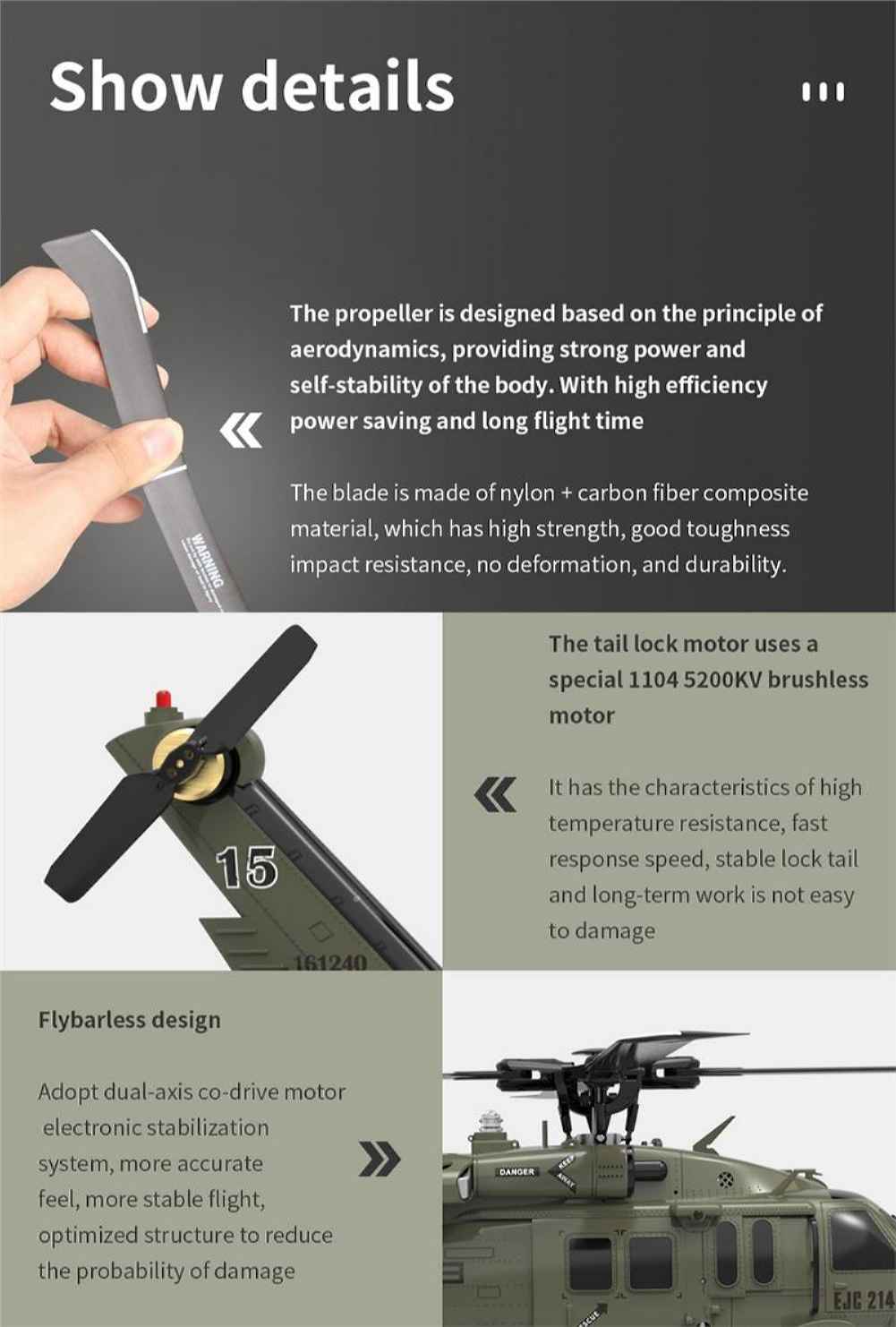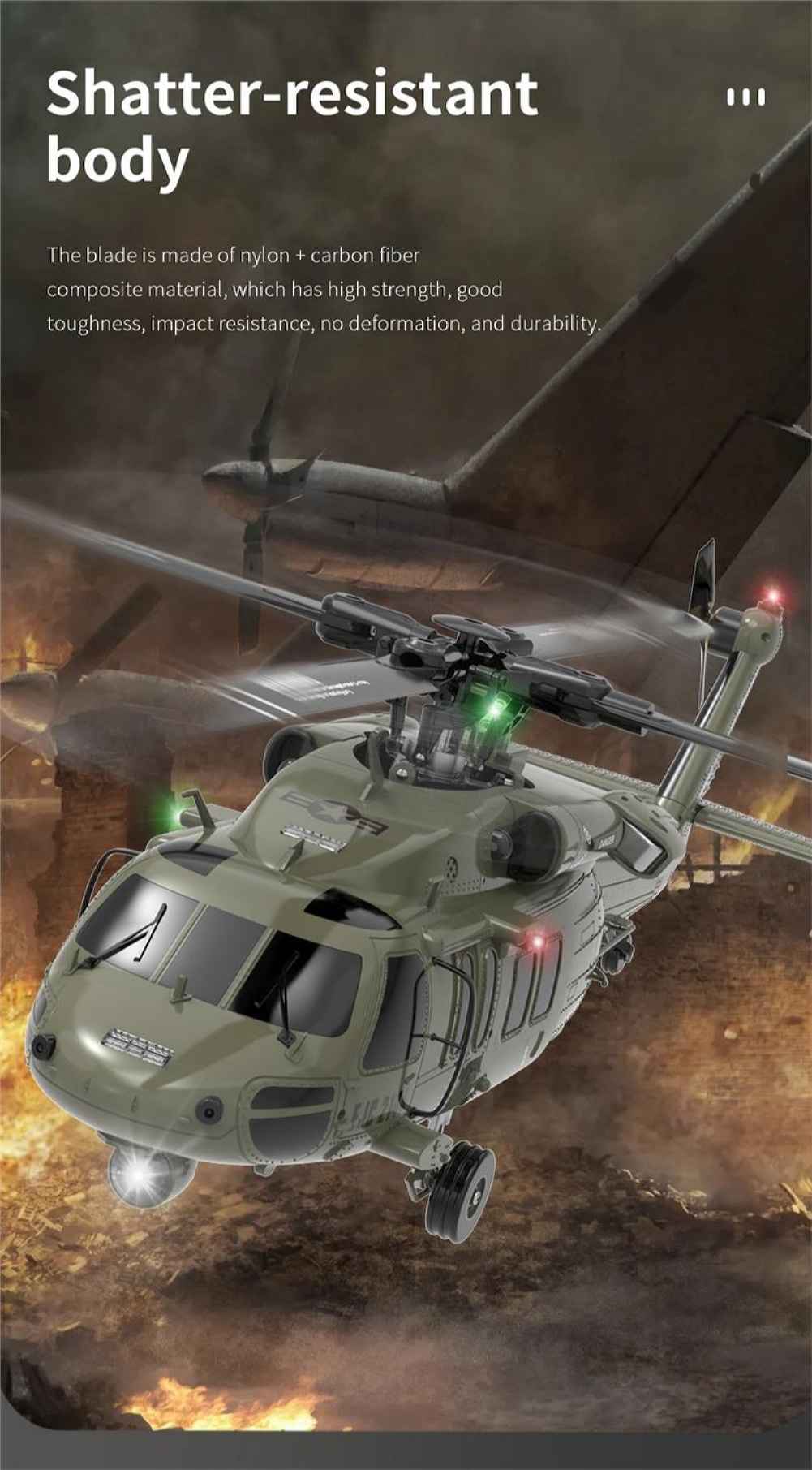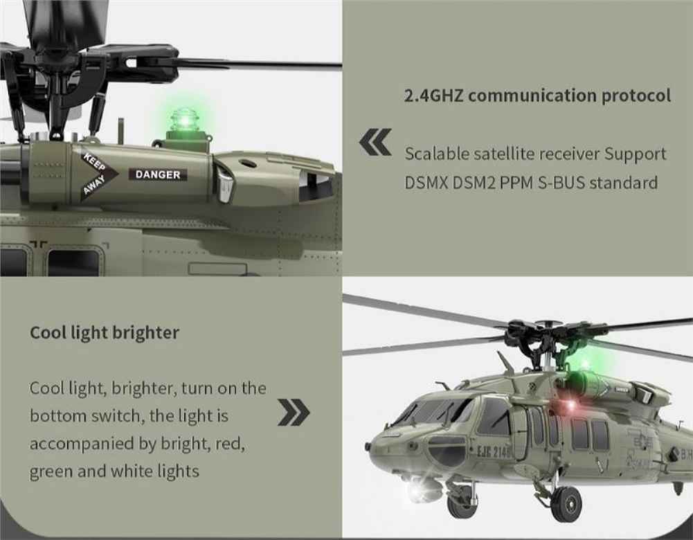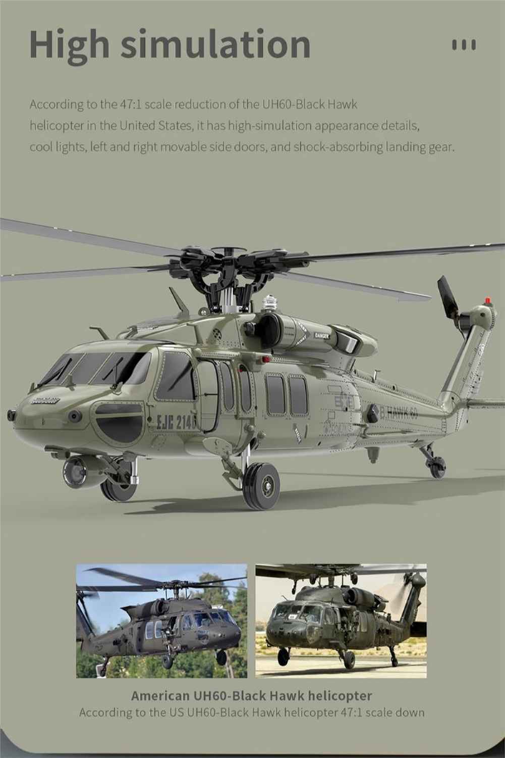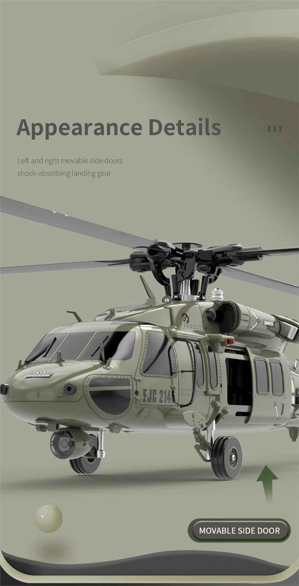 1> It is scaled down according to the 47:1 ratio of the U.S. UH60-Black Hawks helicopter, with high-simulation appearance details, cool lights, left and right movable side doors, and shock-absorbing landing gear.