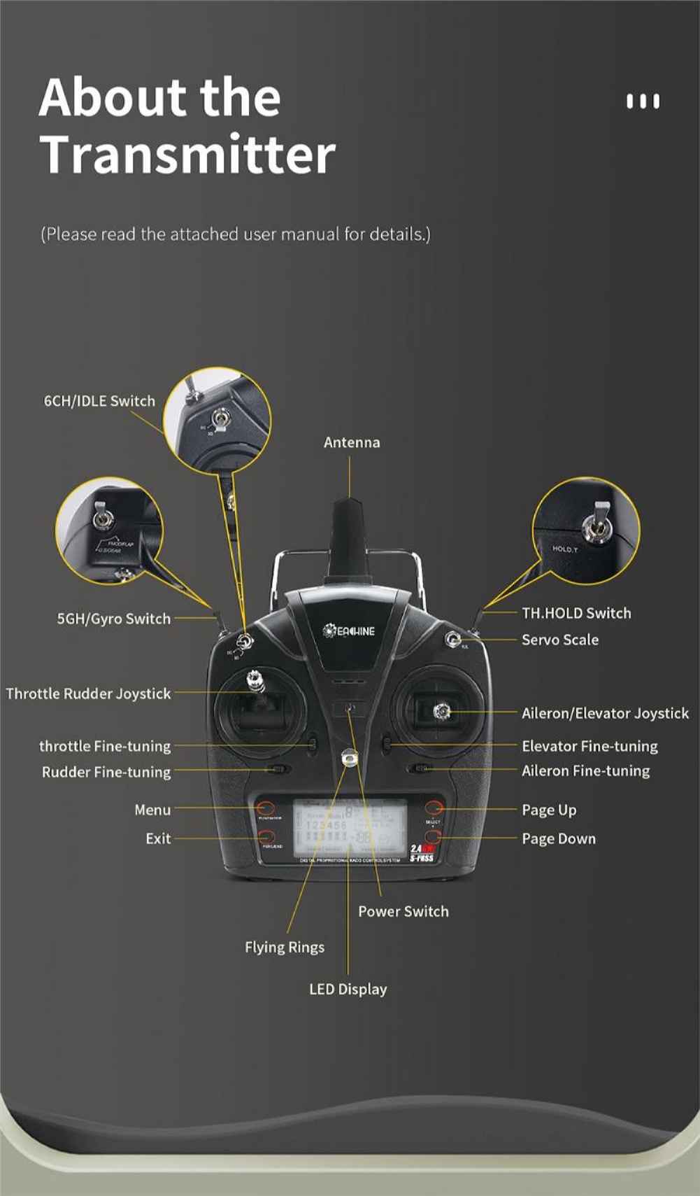 11> Standard six-channel remote control with LCD display, power prompt, support for digital parameter adjustment, support simulator function, and optimize the joystick output, more precise operation.