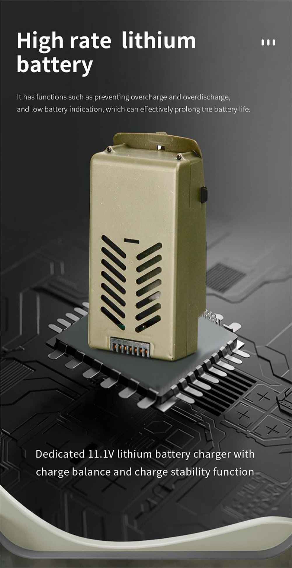 12> Professionally customized high-rate lithium polymer 11.1V 1450mah 30C battery, high discharge rate and long service life. The flight time is about 6-11 minutes, and it can be used for 500+ cycles under normal use. It has functions such as preventing overcharging, over-discharging and low-power indication, which can more effectively extend the battery life.