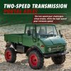 The FMS FCX24 RTR Mercedes-Benz 421 Unimog is a 1/24 scale, 4WD RC rock crawler designed for off-road adventures. With a powerful 130 brushed motor, it reaches speeds up to 15km/h. The vehicle features a two-speed transmission, remote control lighting, and a robust ABS hard body. Its metal gear portal axles and four-link suspension provide superior climbing capabilities. The RC car includes a 7.4V 380mAh Li-ion battery, offering approximately 20 minutes of runtime. The detailed interior and functional hood enhance its realistic appearance. Available in green, red, and silver, this model offers optional modification parts for customization.