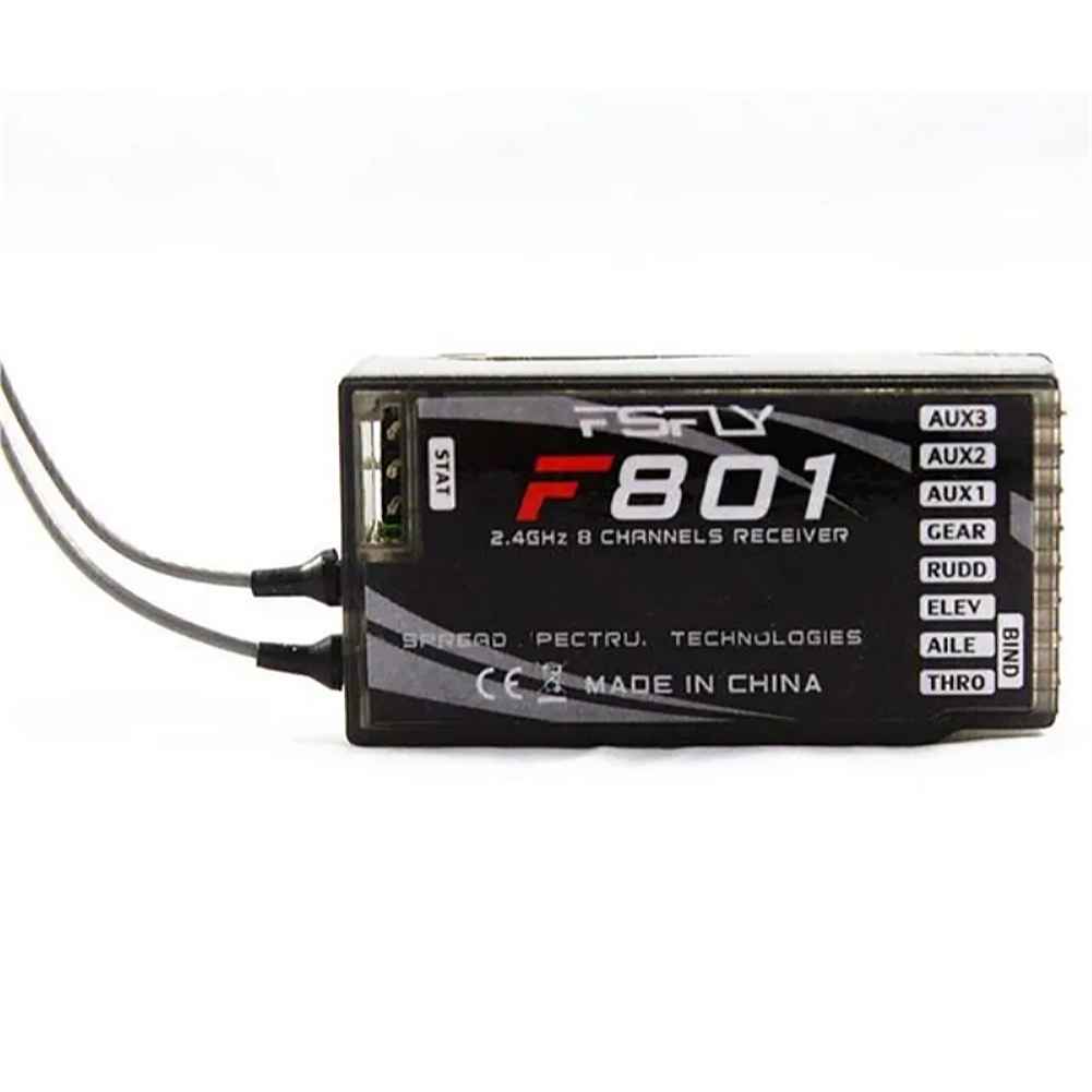 The FSFLY F801 2.4GHz 8-channel receiver is designed for RC helicopters and airplanes, offering robust support for Spektrum DX6, DX7, and DX8 transmitters. Compatible with DSM-X and DSM2 modulation, this receiver provides a full range up to 7 channels, outperforming the AR8000 receiver. Its dual-path redundancy and strategic placement ensure a secure RF link in diverse environments. With a range of up to 2km and a voltage range of 3.5 to 9.6V, this receiver is equipped with a special 3bdi gain antenna for enhanced performance. Ideal for quadcopters, it simplifies setup by eliminating the need for an extra satellite.