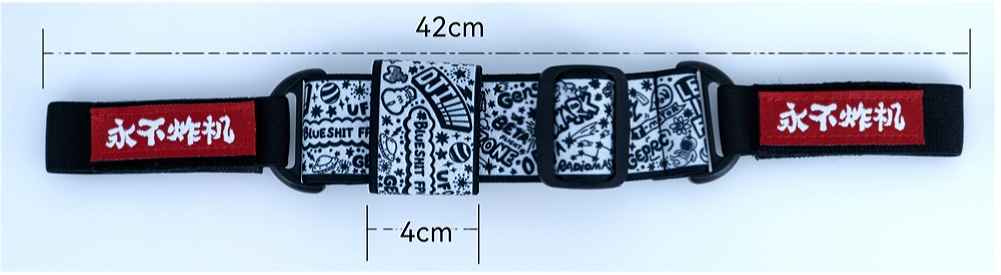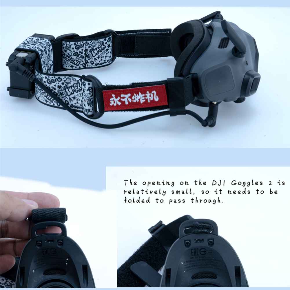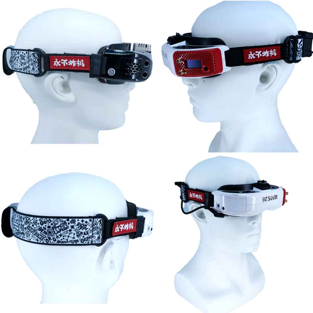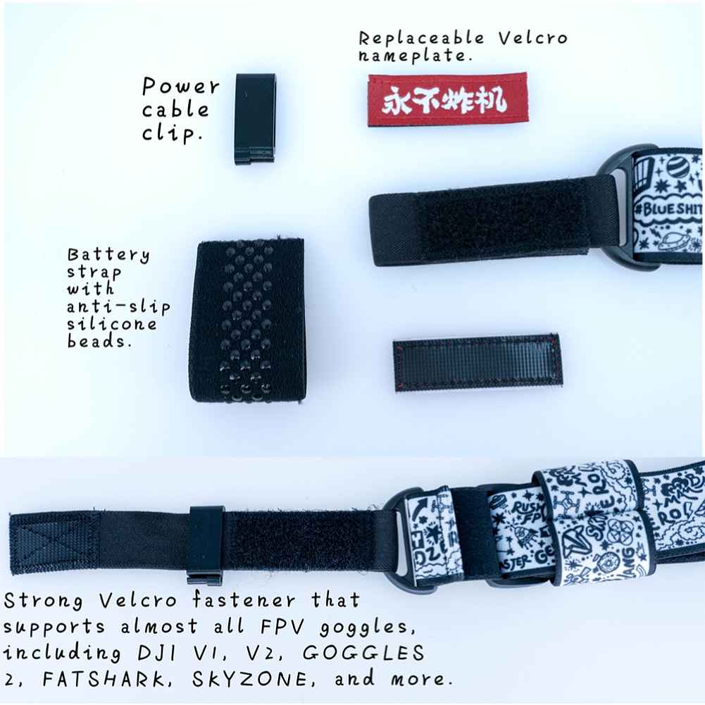 This FPV goggle head strap was hand-designed by the designer. The logo nameplate is made using a VelcroFastener, allowing buyers to replace it with their preferred badge. The battery strap can secure batteries of various sizes, and we also include a battery clip to prevent the battery connector from disconnecting during use.