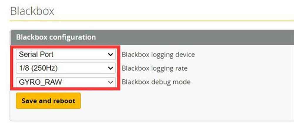 For Gyroflow useage, Move to blackbox tab the and select Serial Port, 250HZ, GYRO_RAW. After each setting is completed, click the Save and Restart button.