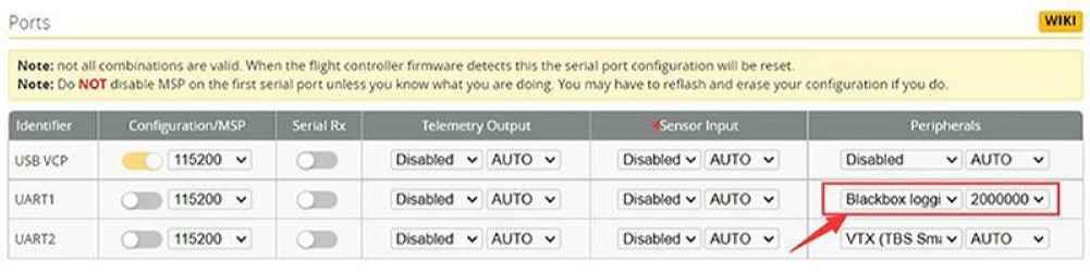 Prepare your own Micro SD card. Connect the Blackbox module and the flight controller correctly. Refer to the wiring diagram for the connection method. Use our Mobula7 1S HD as a sample. Enable Blackbox logging in the peripherals of UART1, set the baud rate to be 2000000.