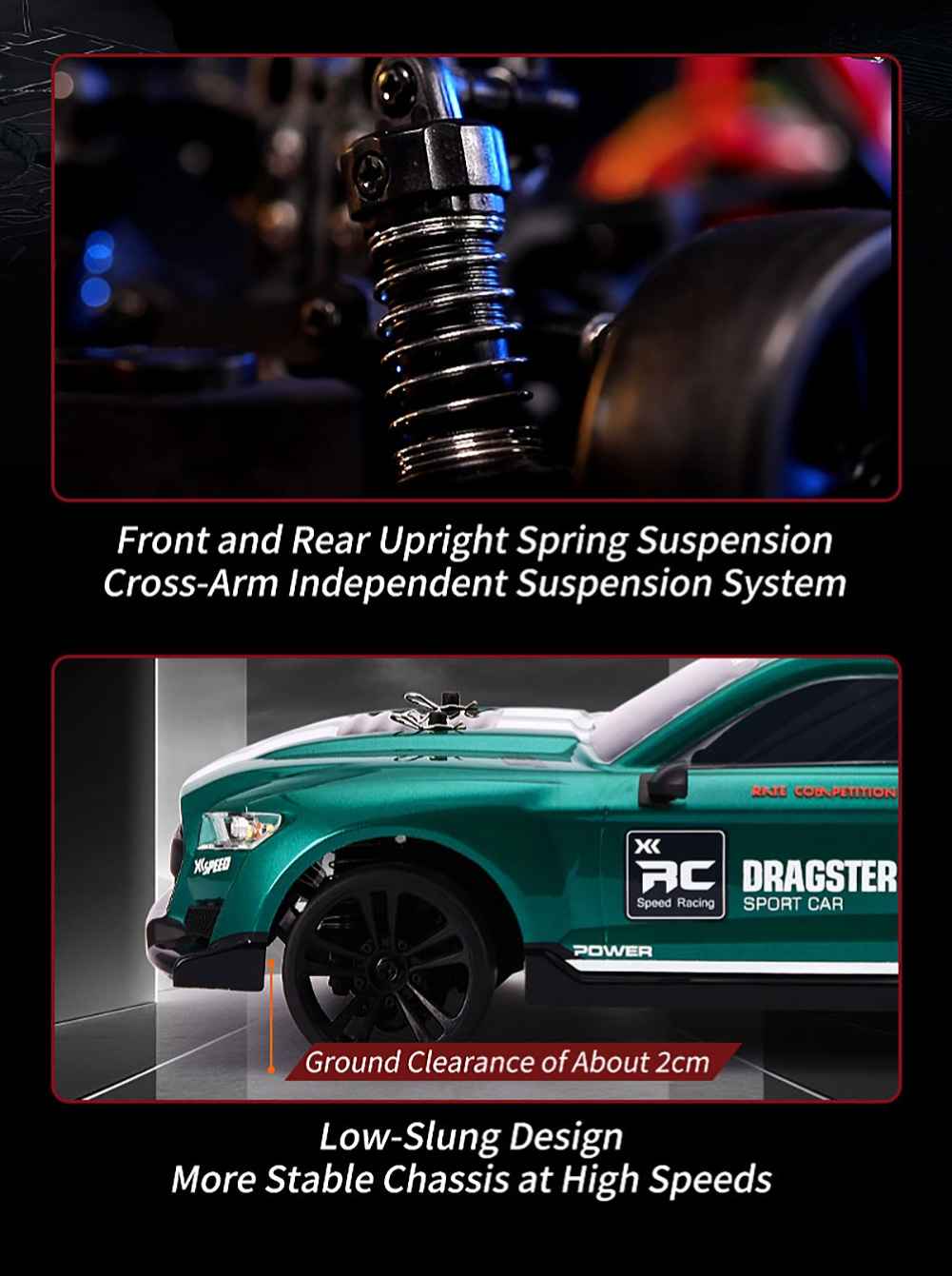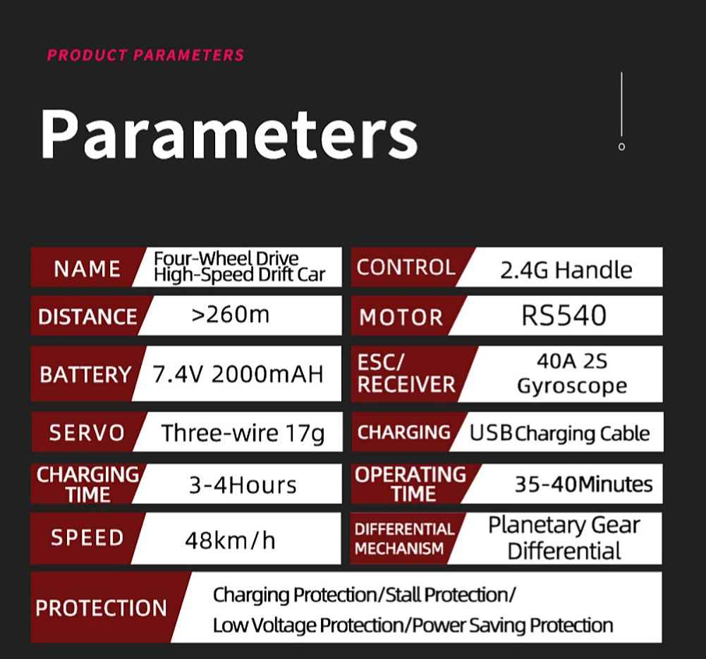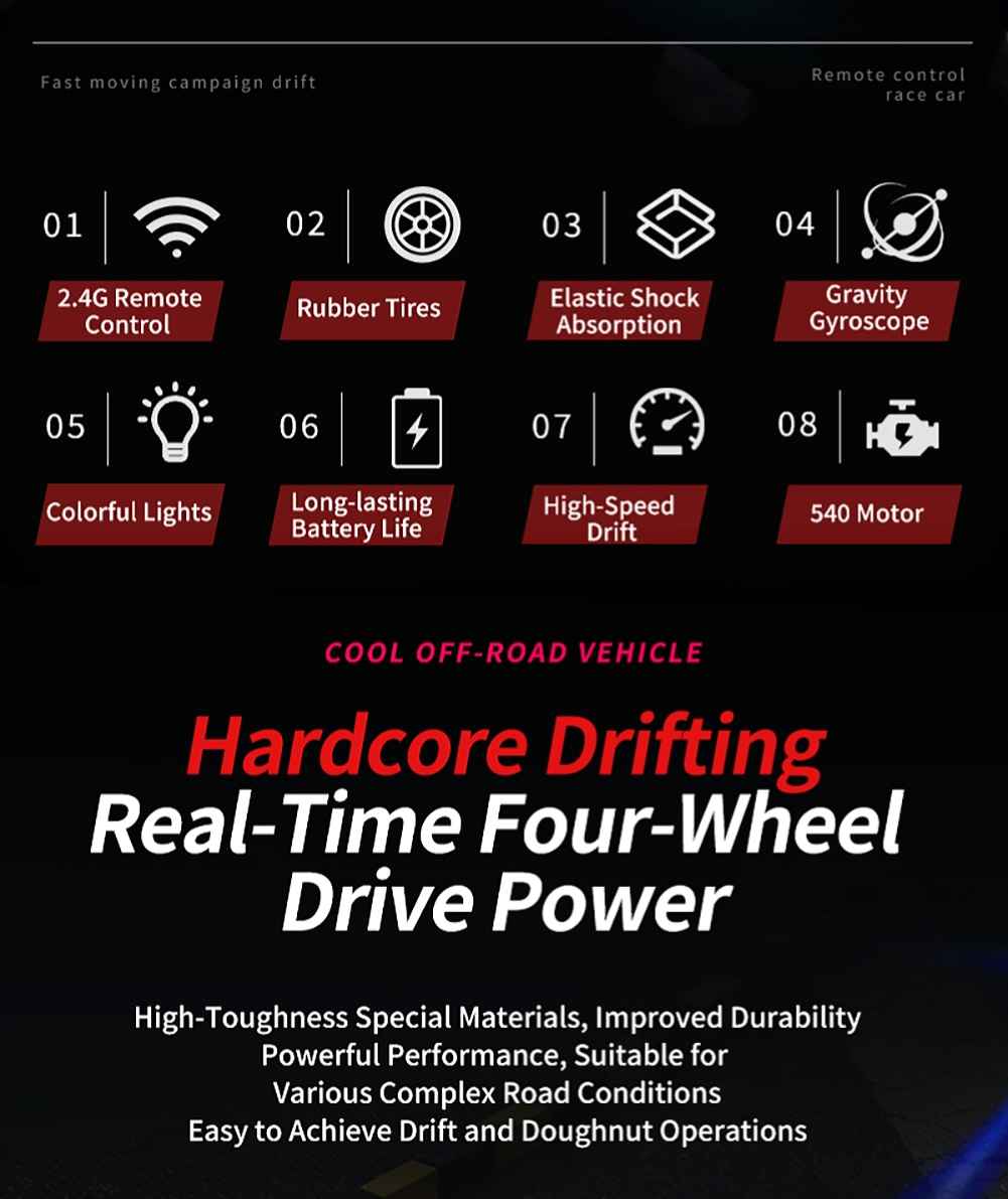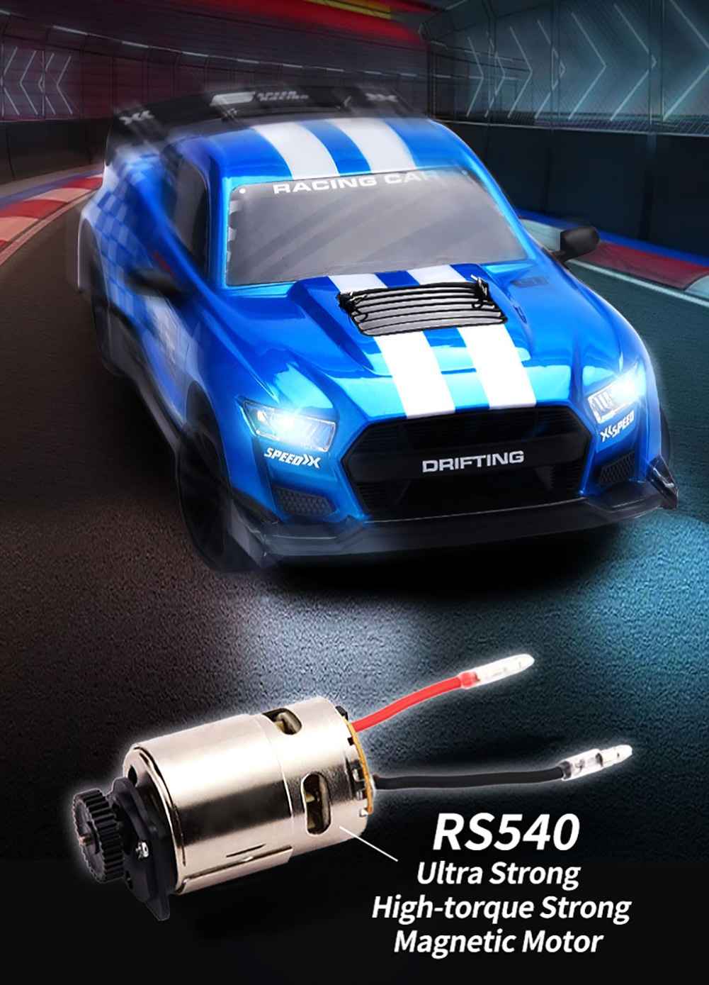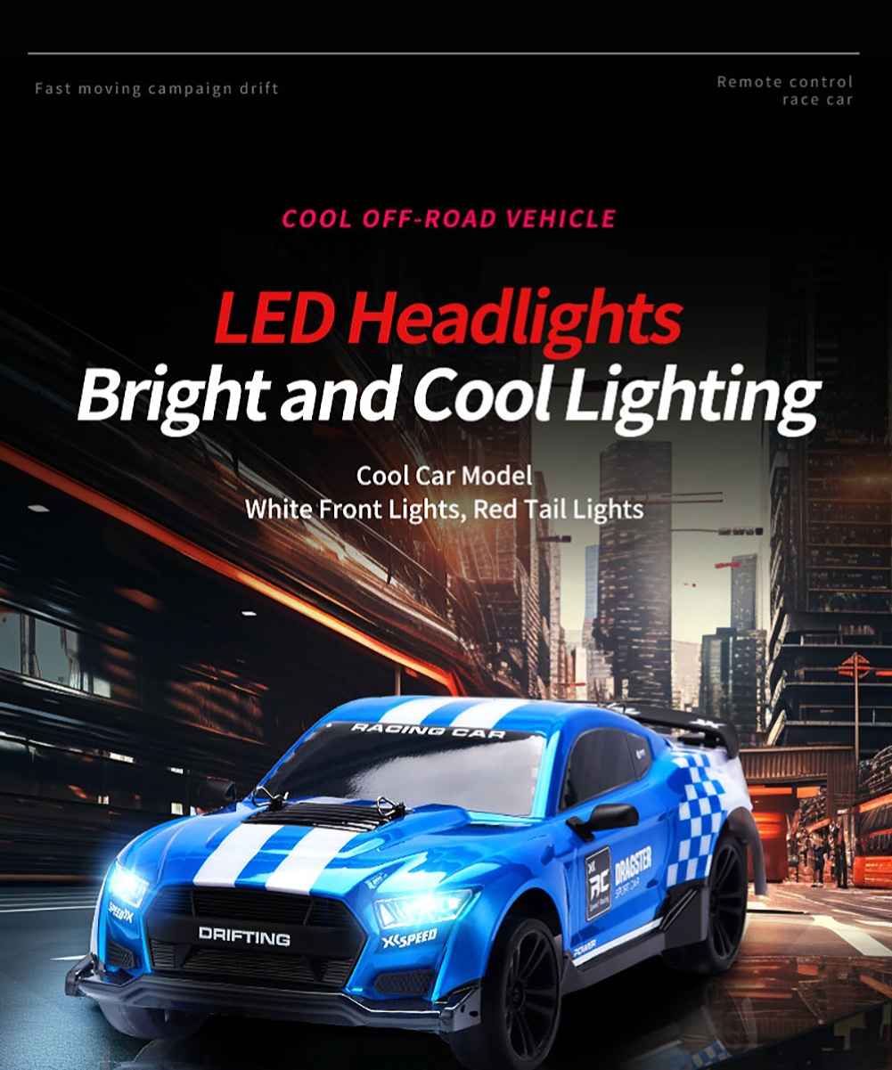 Experience thrilling high-speed racing with the HX 1/14 2.4G 4WD RC Car. Designed for enthusiasts, this model 8616 RC car features a powerful RS540 high torque motor and a 40A 2S integrated control system, delivering a top speed of 30 km/h. The car is equipped with a 3-wire, 17g digital servo and operates at a 2.4G frequency, ensuring precise control up to a distance of 50 meters. With a durable 7.4V 2000mAh Li-ion battery, enjoy up to 25 minutes of playtime after a 3-4 hour charge. The vehicle’s LED lights add a realistic touch, with white front lights and red rear lights. Perfect for drift racing enthusiasts, this RC car offers full proportional control and an exciting driving experience.