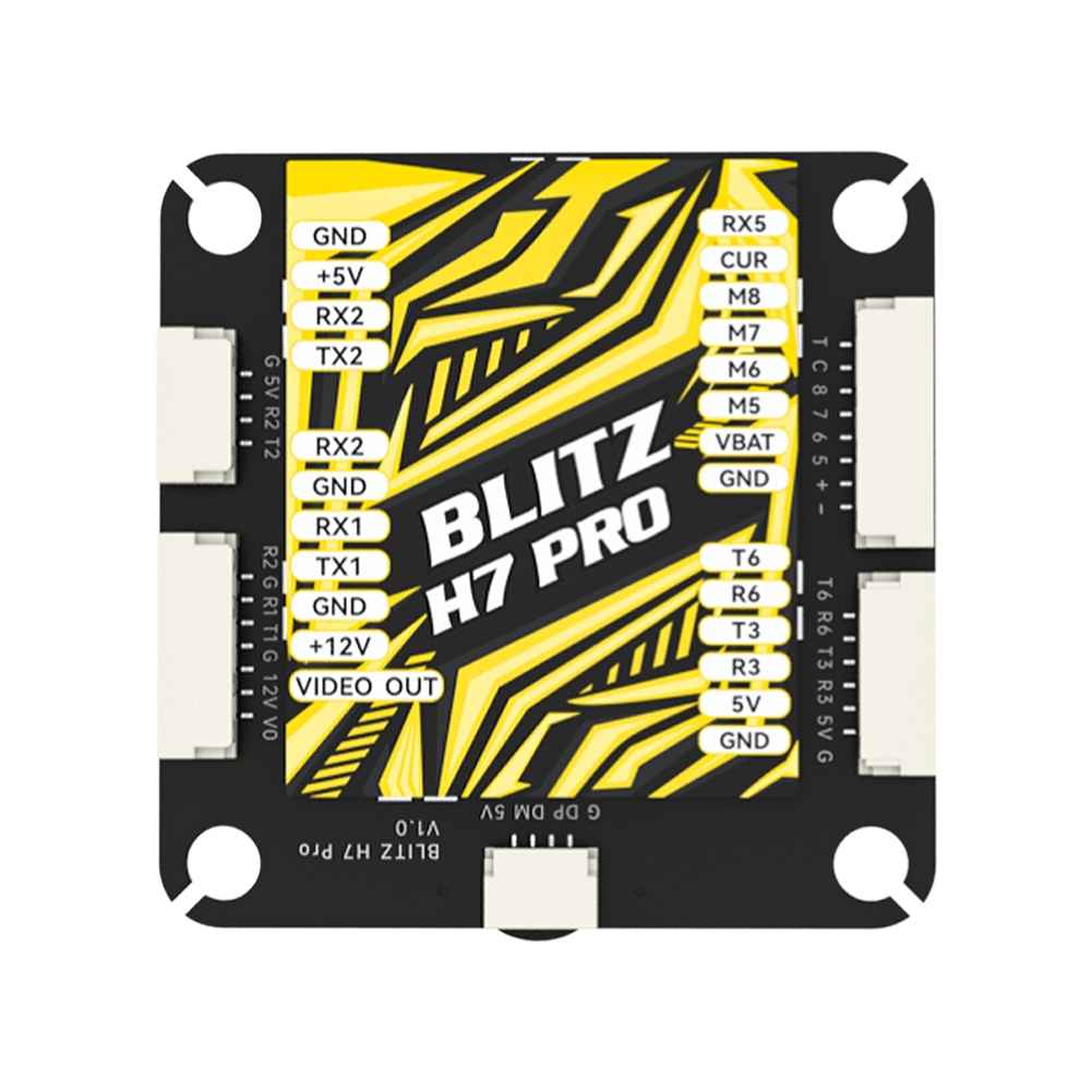 Introducing the BLITZ H7 Pro Flight Controller – a powerhoue with a dual-sided shielding design that not only protects against interference but also safeguards the controller from debris, ensuring seamless operation. The detachable shielding allows for easy TF card replacement. Upgraded with a robust STM32H743 MCU, it supports input voltages up to 12S and is compatible with ArduPilot firmware, offering customers endless possibilities. Upgrade to the BLITZ H7 Pro for unparalleled performance.