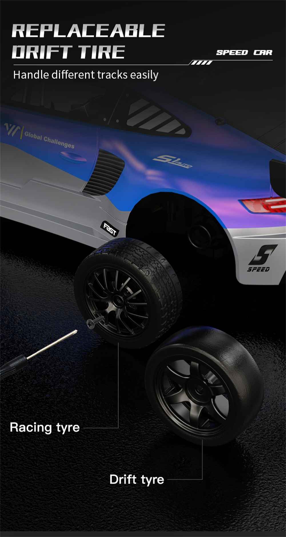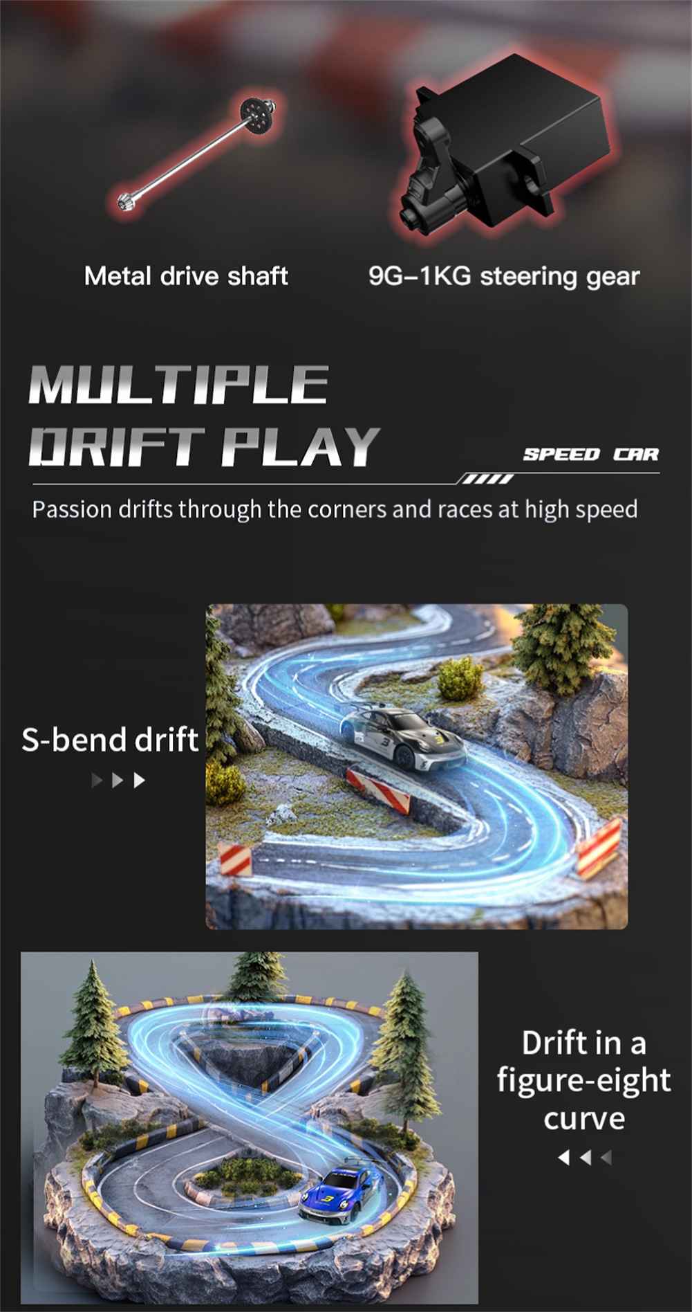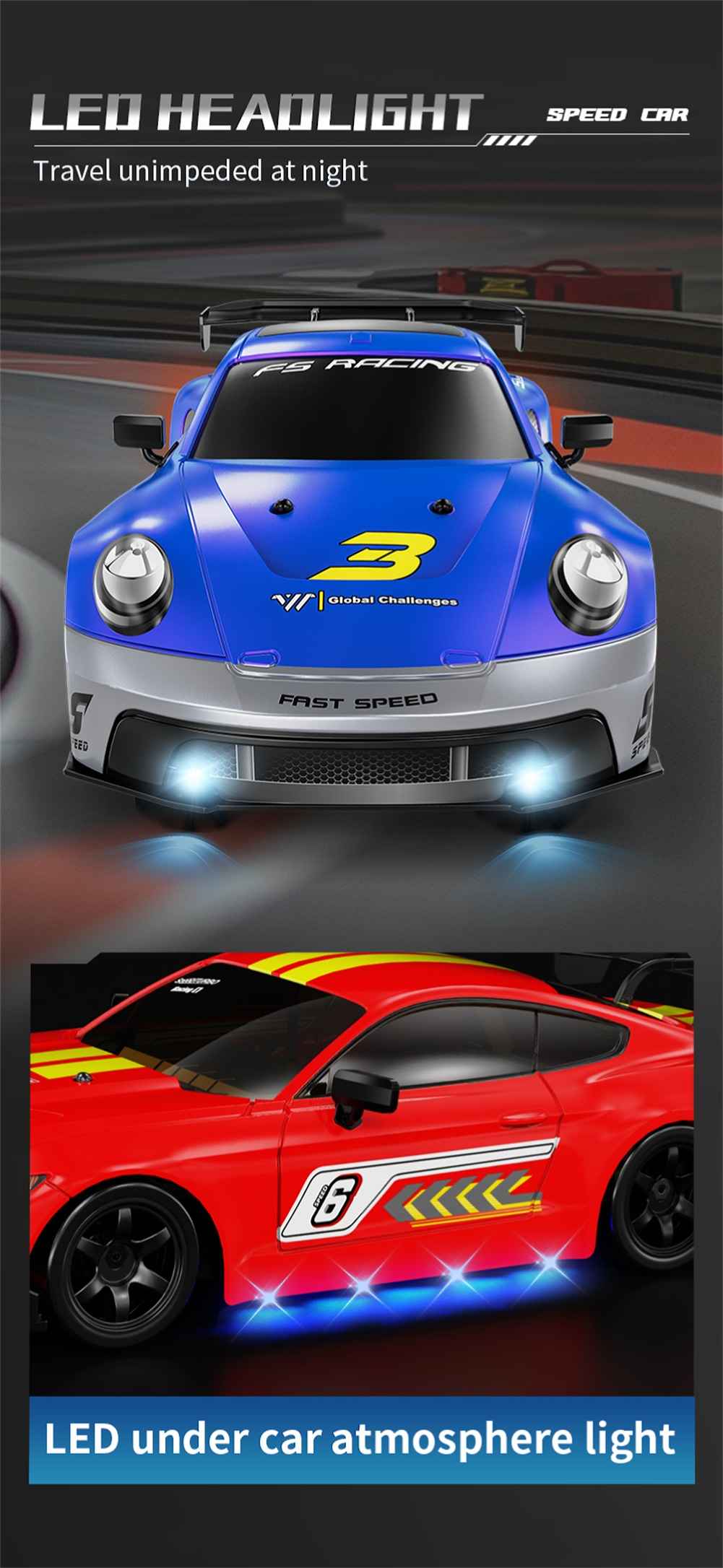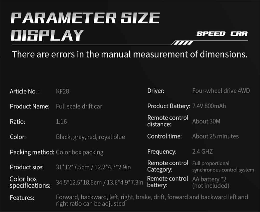The KFPLAN KF28 1/16 Scale Drift RC Car offers an exhilarating driving experience with full proportional control. Designed for RC enthusiasts, this 4WD car is equipped with a 2.4GHz transmitter and a 7.4V 800mAh LIPO battery, providing a control distance of up to 30 meters. Enjoy 25 minutes of runtime after a 1-hour charge. The car features forward, backward, left, and right functions, enhanced by LED headlights and under-car atmosphere lighting for a realistic driving experience. Available in black, red, dark gray, and blue, this model is perfect for indoor and outdoor fun.