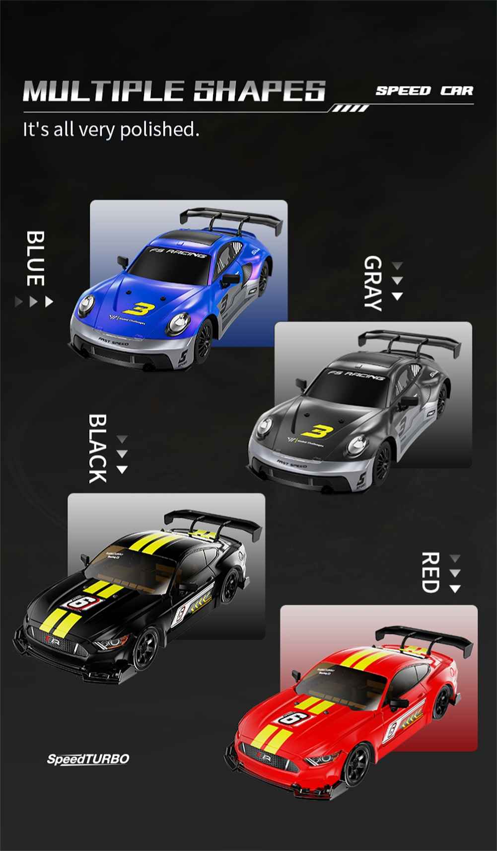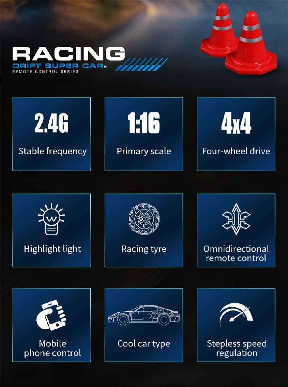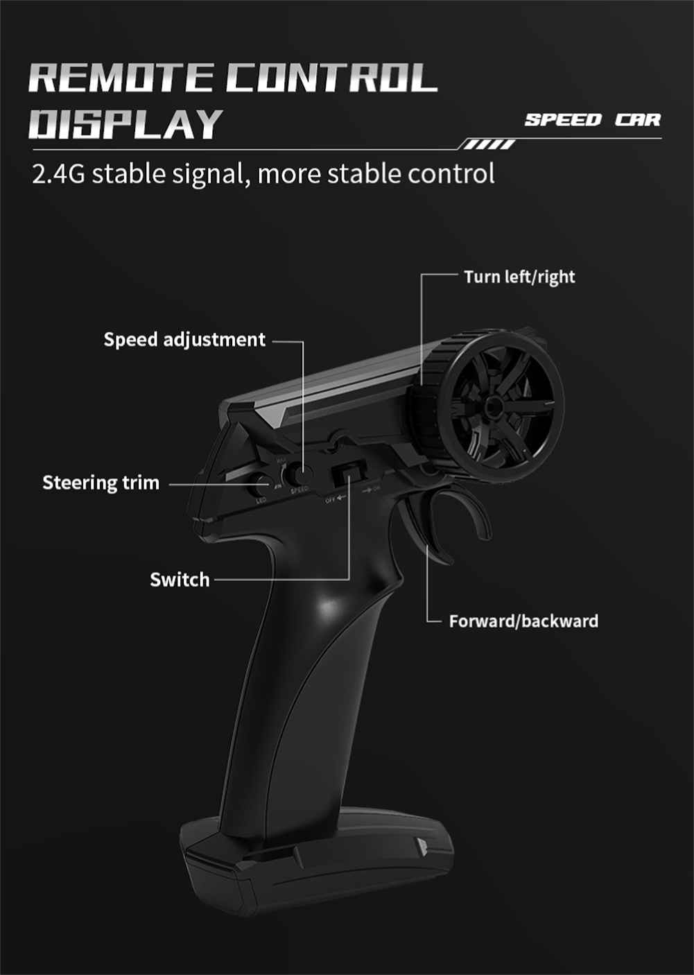 The KFPLAN KF28 1/16 Scale Drift RC Car offers an exhilarating driving experience with full proportional control. Designed for RC enthusiasts, this 4WD car is equipped with a 2.4GHz transmitter and a 7.4V 800mAh LIPO battery, providing a control distance of up to 30 meters. Enjoy 25 minutes of runtime after a 1-hour charge. The car features forward, backward, left, and right functions, enhanced by LED headlights and under-car atmosphere lighting for a realistic driving experience. Available in black, red, dark gray, and blue, this model is perfect for indoor and outdoor fun.