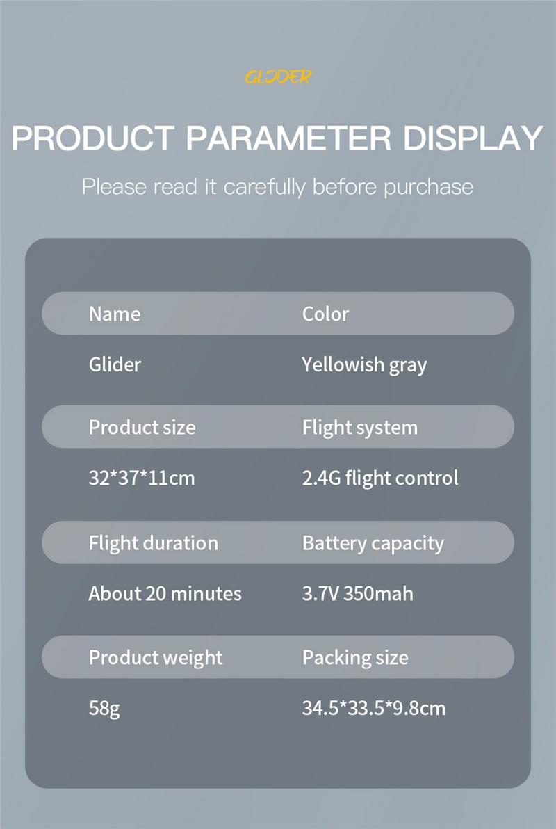 User-Friendly Battery Design: The glider comes with a replaceable battery structure, allowing for uninterrupted flight enjoyment, providing an easy-to-use and exciting flight experience.