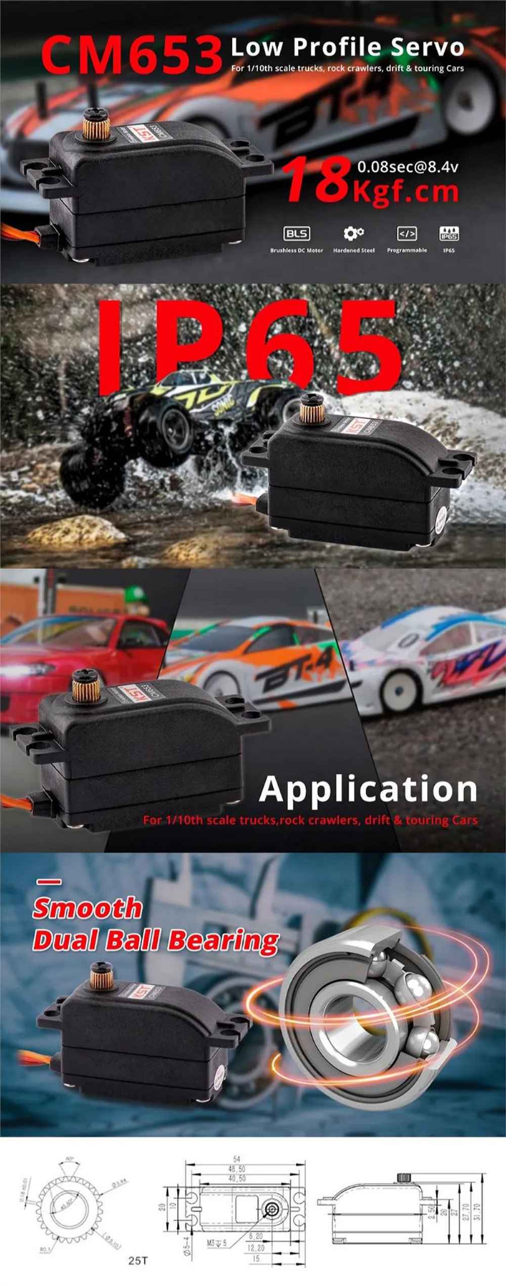 CM653 Low Profile servo offers fast responses, high efficiency, ultra-high torque, excellent speed and IP65 splash-proof. Perfect for 1/10th scale trucks, rock crawlers, drift & touring cars.
