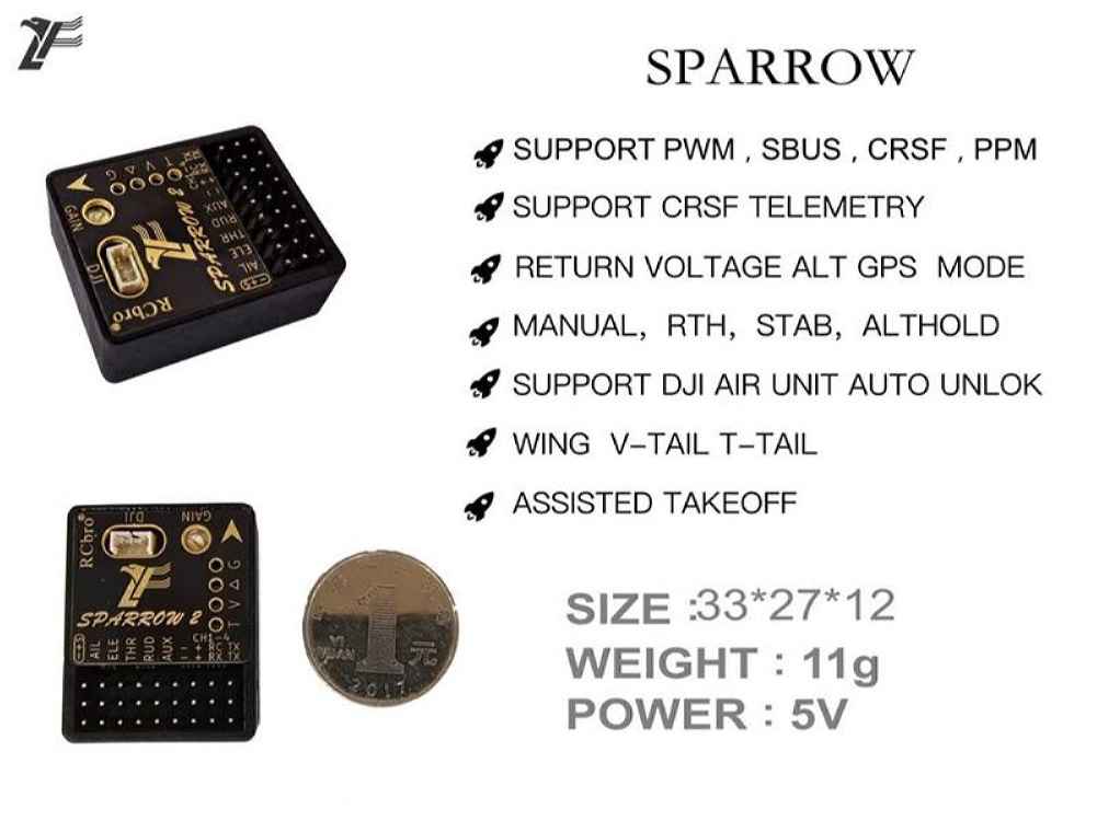 On the basis of the SPARROW FC, SPARROW 2 has updated the operation mode to simplify the user’s use and enhance the operation experience. At the same time, it adds support for a variety of receiver signals, including PWM,PPM,SBUS,IBUS,CRSF and supports DJI-OSD,CRSF-TELE.