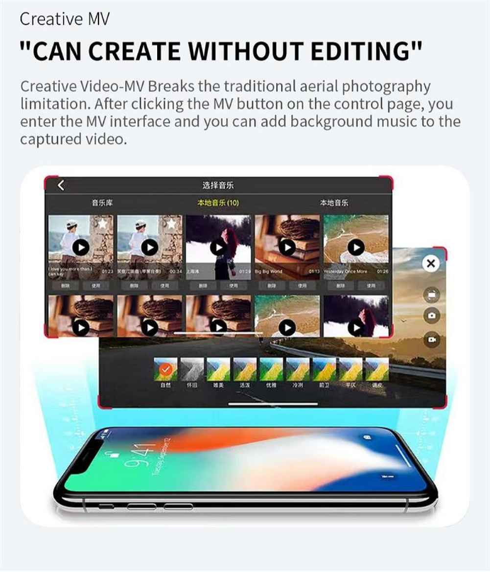 – MV functions: filters, video effects, add background music, picture / video sharing