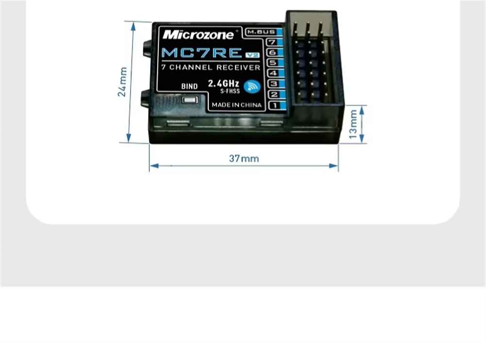 The Microzone MC7RE V2 is a 2.4GHz 7-channel RC receiver designed for RC airplanes, cars, and boats. With a transparent brown casing, it supports both PWM and SBUS signals, offering compatibility with MC6mini, MC7mini, and MC8mini transmitters. The receiver operates within a frequency band of 2401MHz to 2478MHz, ensuring a receiving distance of over 800 meters. It features an external dual antenna for enhanced signal reception and quick recovery, as well as a fail-safe setting for added security. The compact design measures 37mm x 24mm x 13mm and weighs just 7 grams, making it an ideal choice for various RC models.
