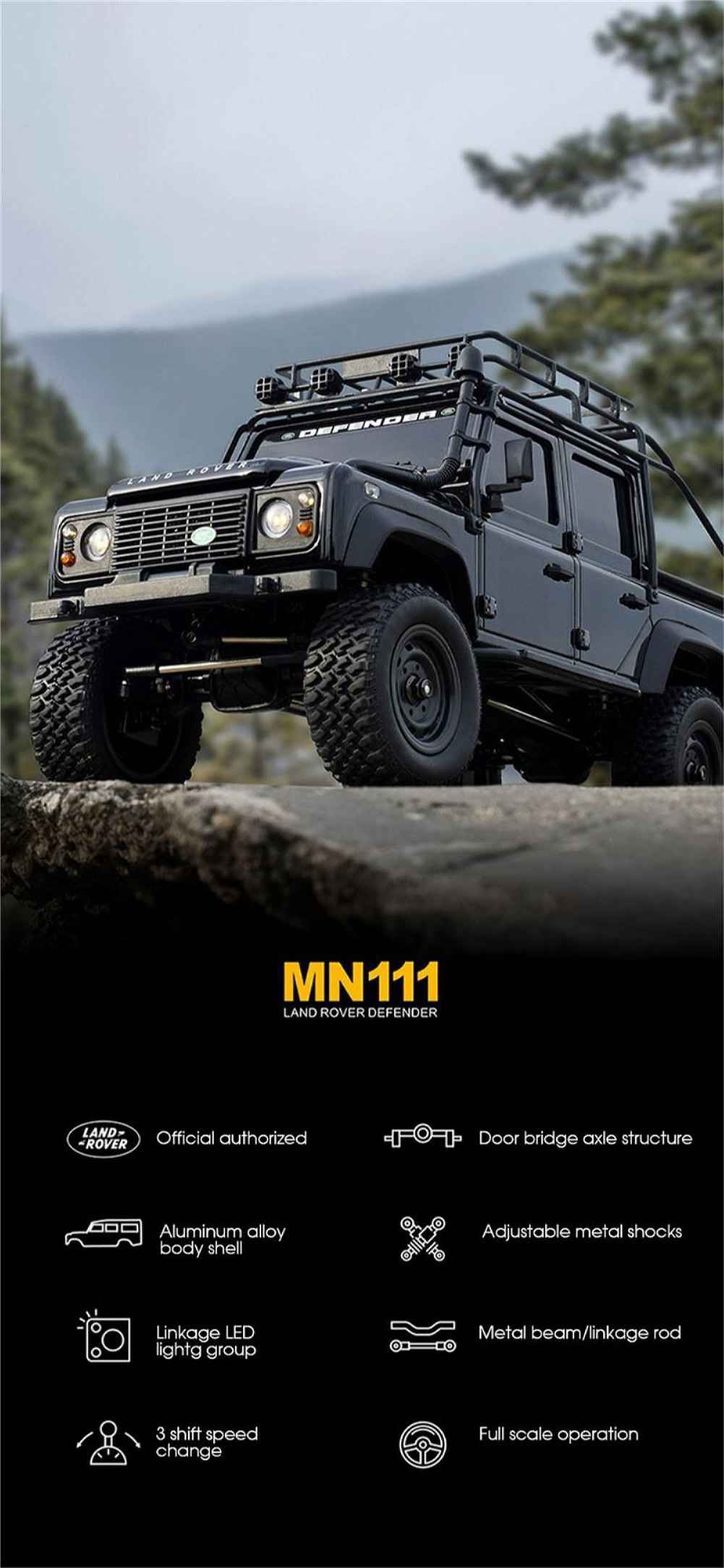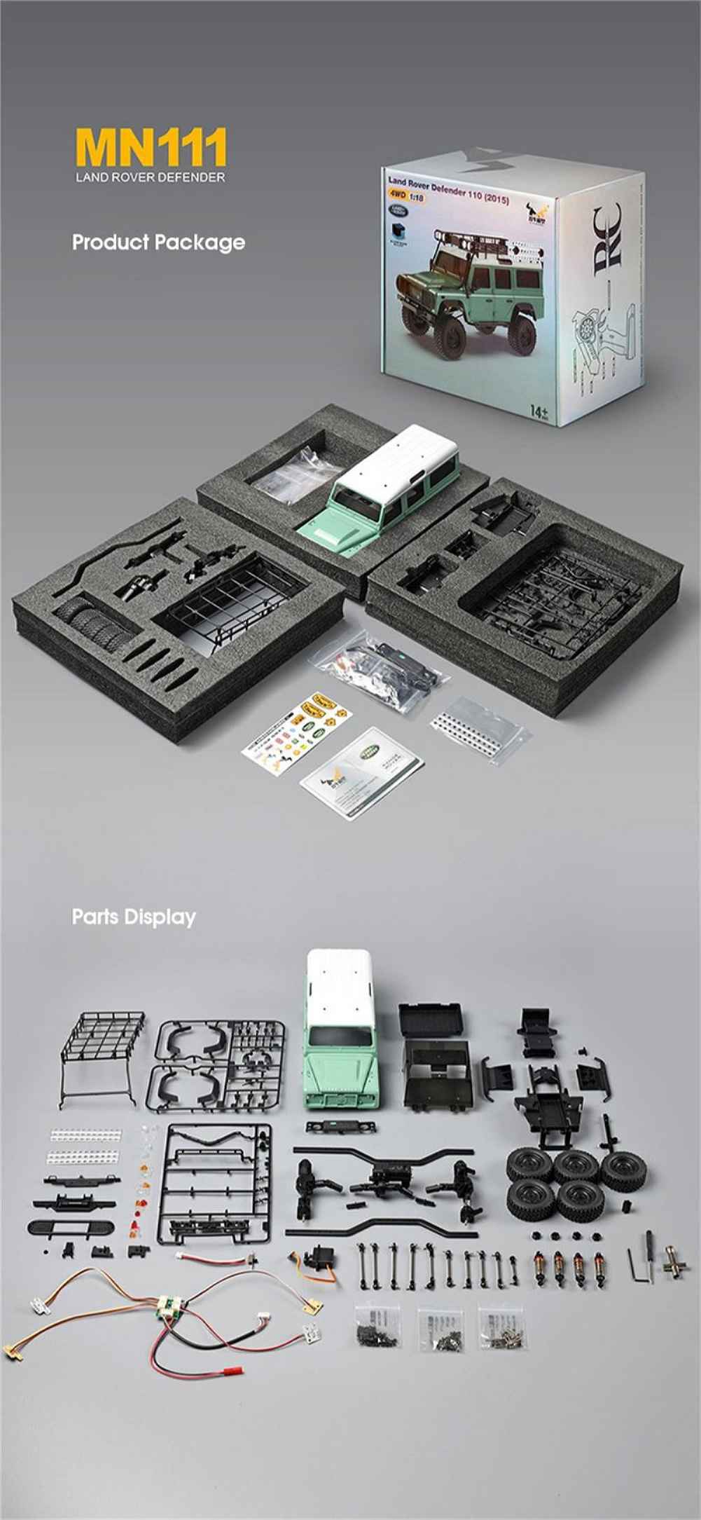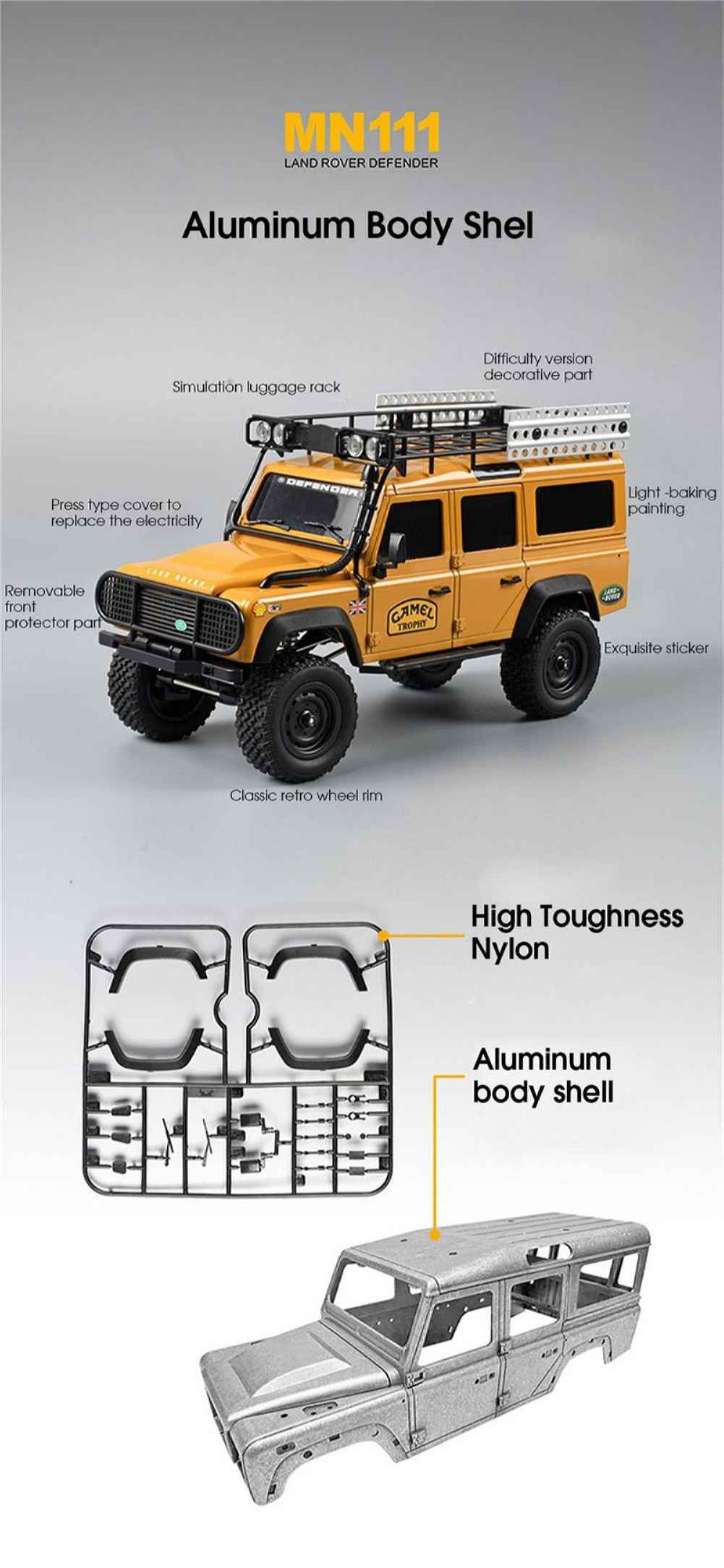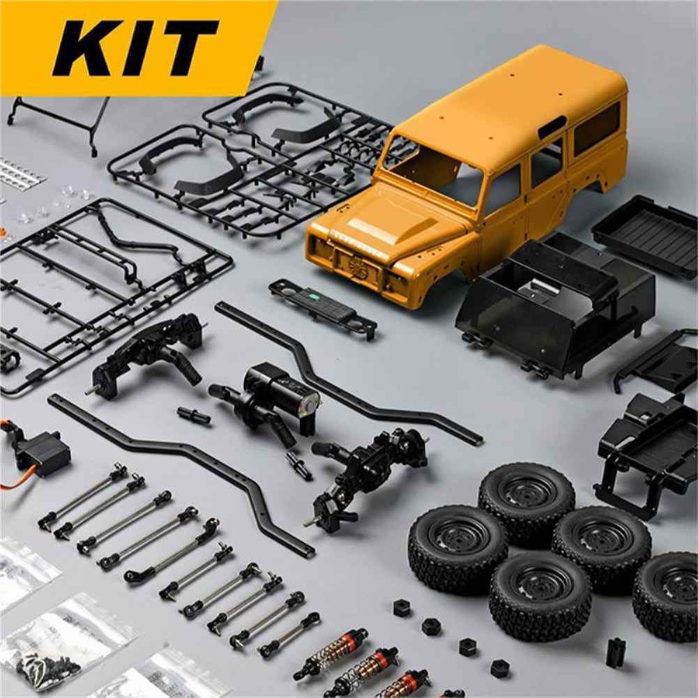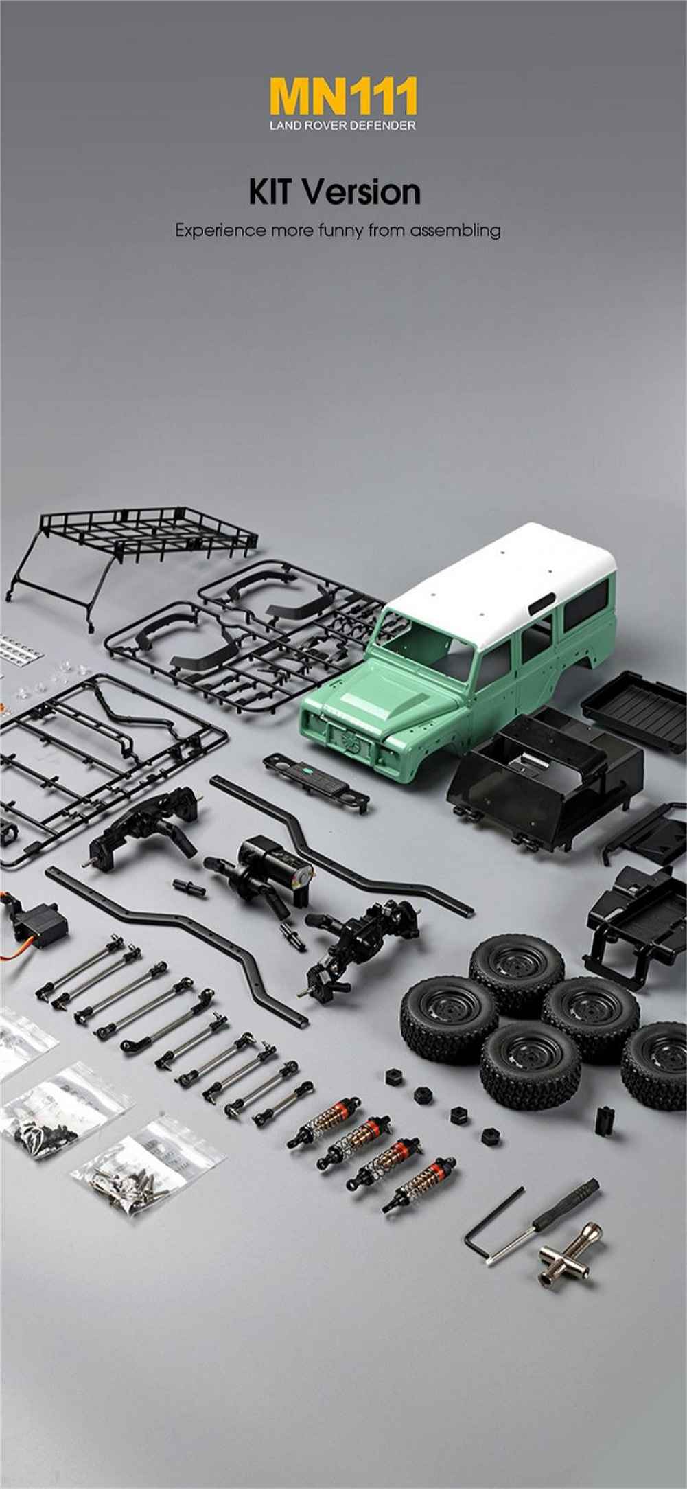 The MNRC MN111 DIY Kit is a 1/18 scale 4X4 RC car designed for hobbyists who enjoy assembling their own models. This kit features an aluminum alloy body shell, offering a lightweight yet sturdy build. It includes a door portal bridge axle structure for enhanced ground clearance and adjustable metal shock absorbers for improved suspension. The model boasts high grip simulation tires and a 26mm high chassis, making it capable of tackling various challenging terrains. Note that this kit version requires additional components such as a remote controller, battery, charger, and ESC, which are not included. Enjoy the satisfaction of building your own off-road truck and experience its strong climbing ability.
