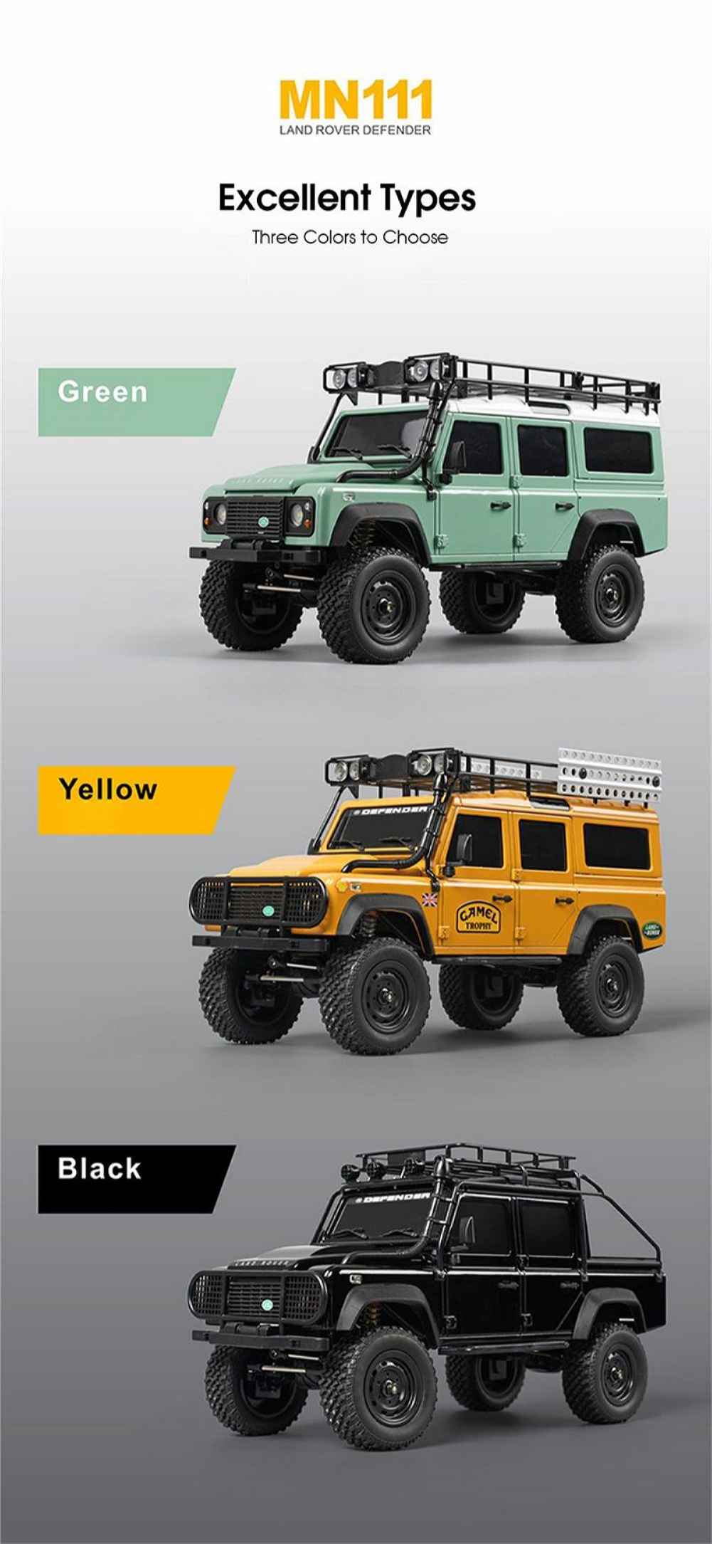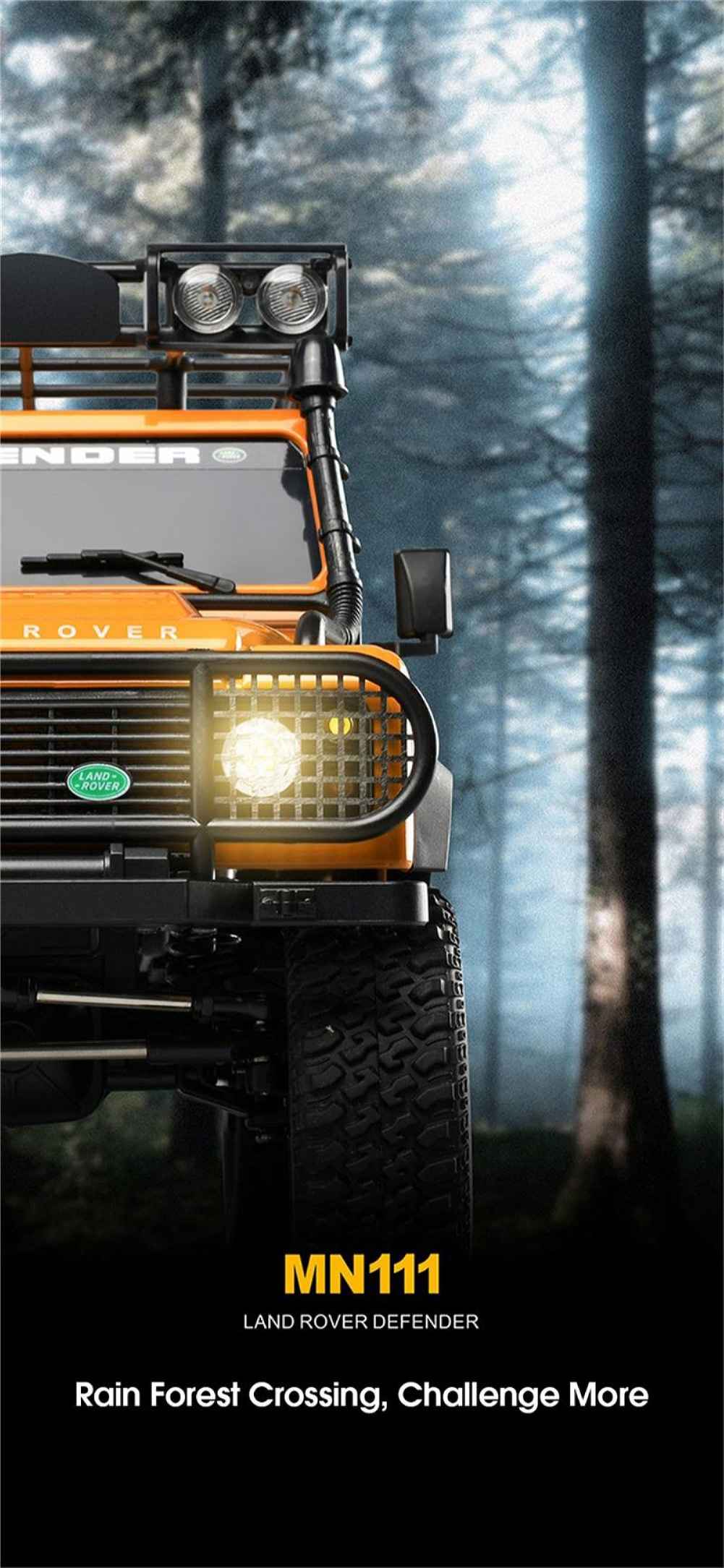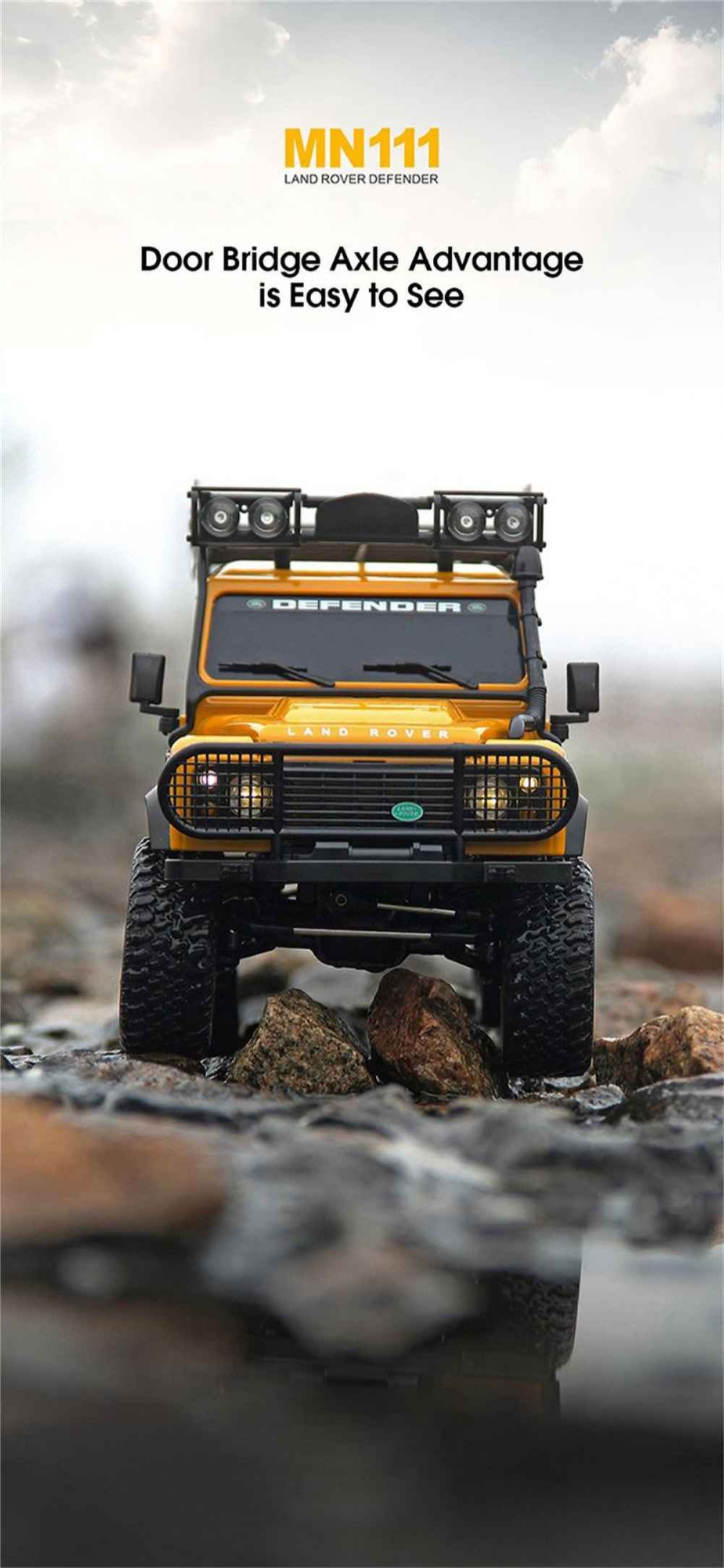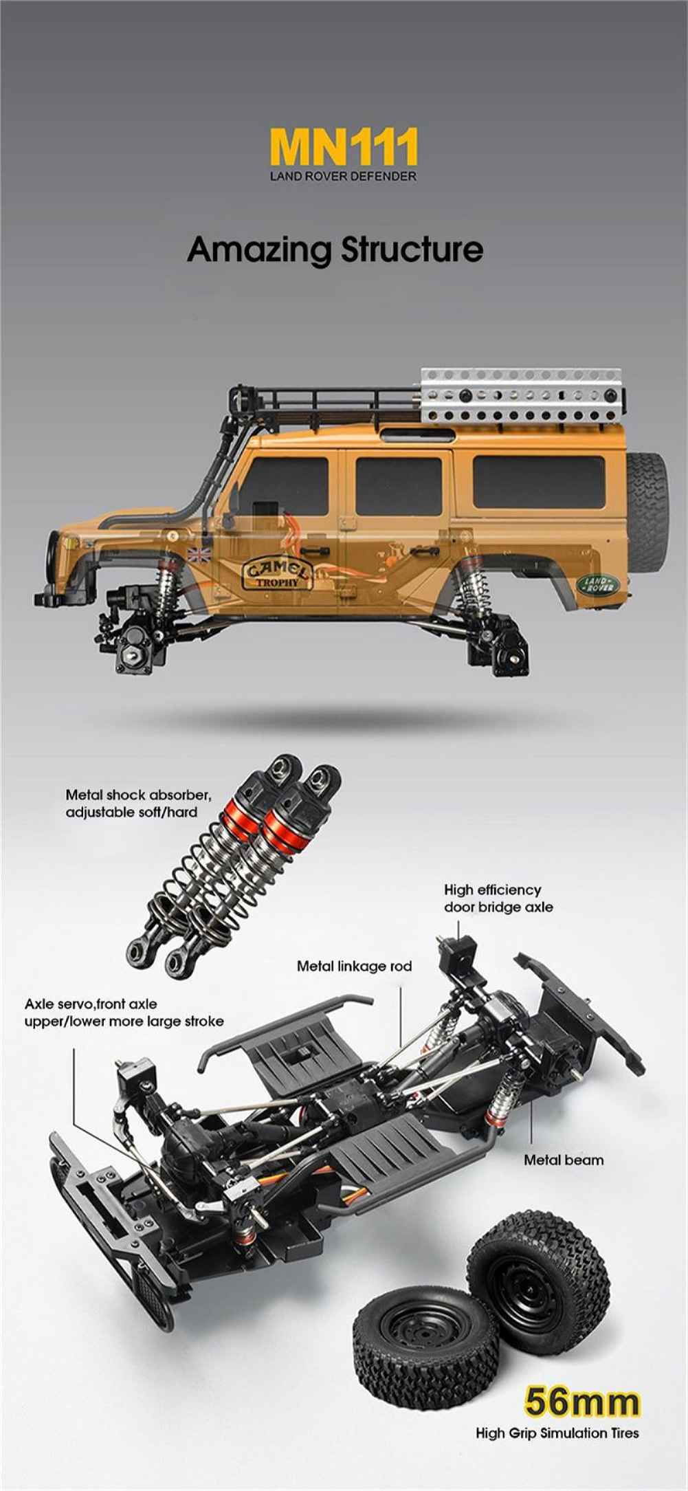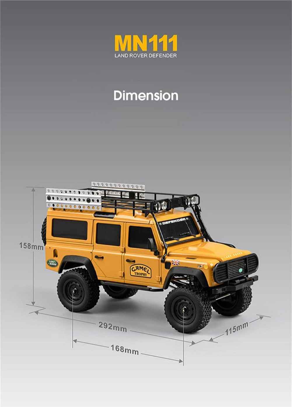 The MNRC MN111 DIY Kit is a 1/18 scale 4X4 RC car designed for hobbyists who enjoy assembling their own models. This kit features an aluminum alloy body shell, offering a lightweight yet sturdy build. It includes a door portal bridge axle structure for enhanced ground clearance and adjustable metal shock absorbers for improved suspension. The model boasts high grip simulation tires and a 26mm high chassis, making it capable of tackling various challenging terrains. Note that this kit version requires additional components such as a remote controller, battery, charger, and ESC, which are not included. Enjoy the satisfaction of building your own off-road truck and experience its strong climbing ability.