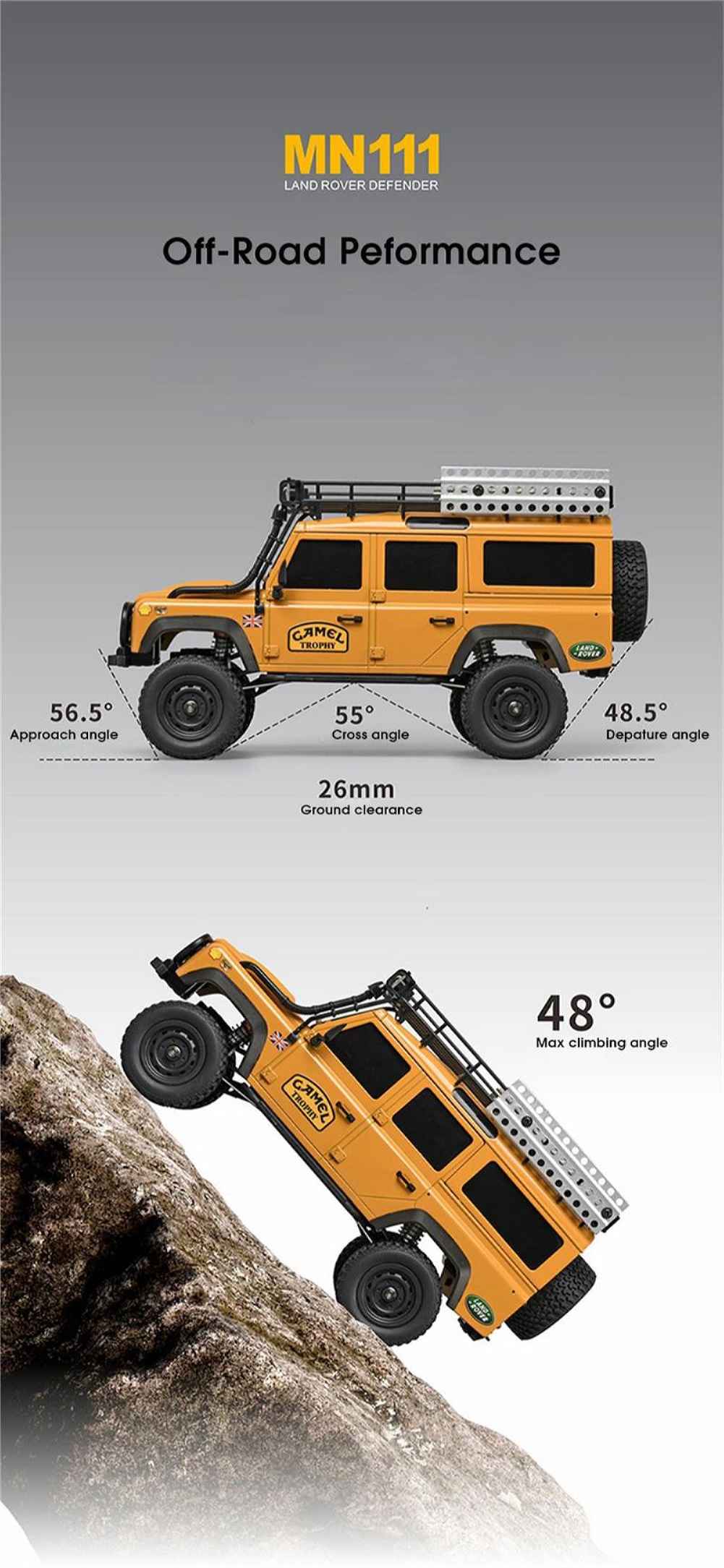 26mm high chassis design,cross angle is 55~,max climbing angle is 48~,approach angle is 56.5~,