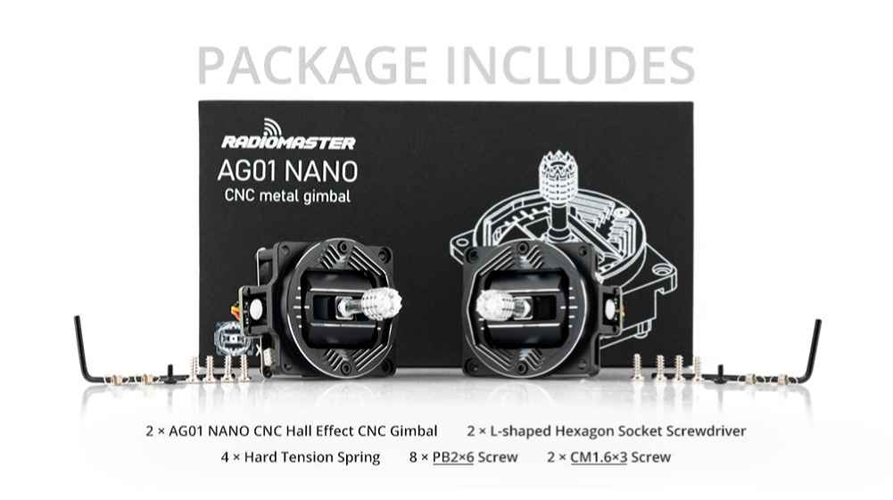 2 x AG01 NANO CNC Hall CNC Gimbal 2 x L-shaped Hexagon Socket Screwdriver 4 x Hard Tension Spring 8 x PB2 6 Screw 2 x CM1.6 3 screw 2 x Manual