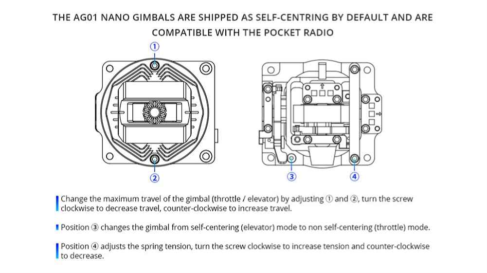 Discover precision engineering and unparalleled control with the RadioMaster AG01 NANO CNC Hall Gimbals, designed for pocket radio transmitters. Made from billet CNC aviation-grade aluminum, these gimbals feature quad precision ball bearings for smooth operation and customizable movement angles from 38ç°ž to 54ç°ž. The non-contact Hall effect sensors provide high-speed, precise sensing with effortless centering. Enjoy a truly intuitive flying experience with adjustable vertical travel angles and self-centering adjustments. Perfectly crafted for smaller pocket radios, these gimbals offer durability and exceptional performance.