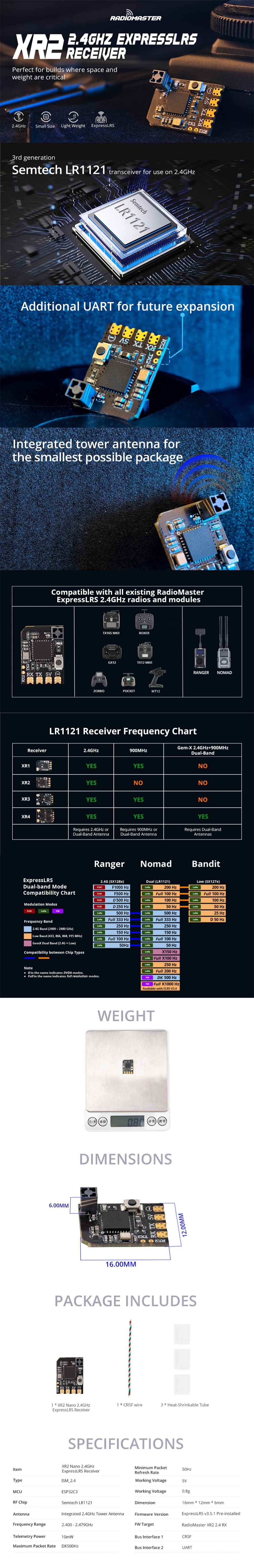 The RadioMaster XR2 Nano 2.4GHz ExpressLRS Receiver is a compact powerhouse designed for seamless integration with Radiomaster TX16S, Boxer, and GX12 Pocket Radios. Its nano-sized design features an integrated tower antenna, providing exceptional reception within a 16x12mm footprint and weighing only 0.8g. Powered by the Semtech LR1121 transceiver, this receiver ensures compatibility with all ELRS 2.4GHz transmitters and supports DK500Hz mode, offering unmatched reliability and responsiveness. The built-in Wi-Fi module facilitates easy firmware updates and configuration through a WebUI on your PC or mobile device. Perfect for Whoops, micro drones, and fixed-wing models, the XR2 delivers ultra-low latency and high refresh rates for optimal performance.
