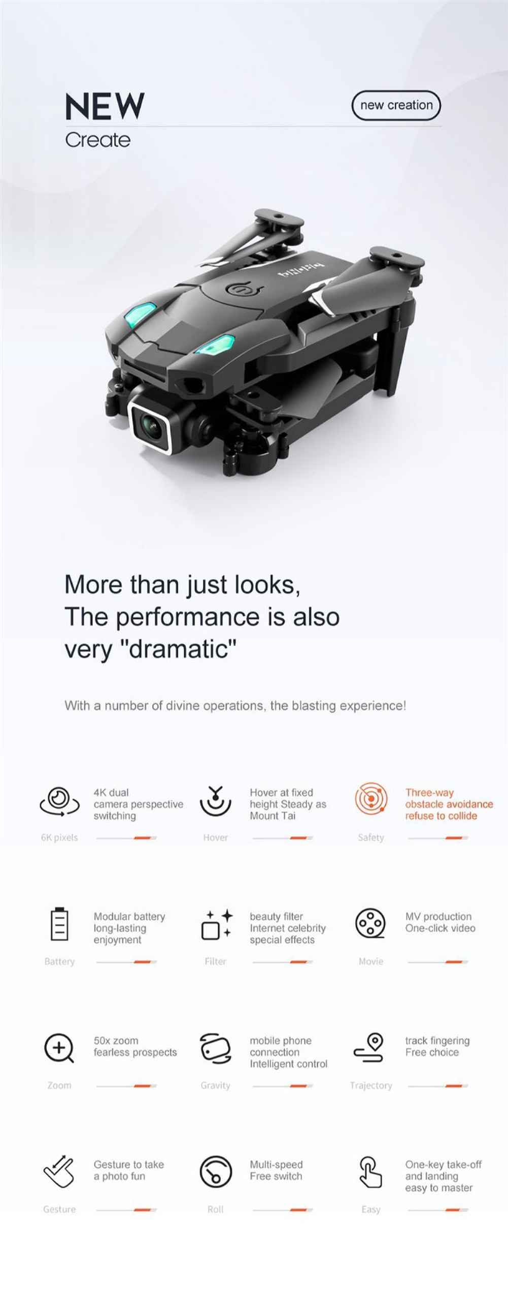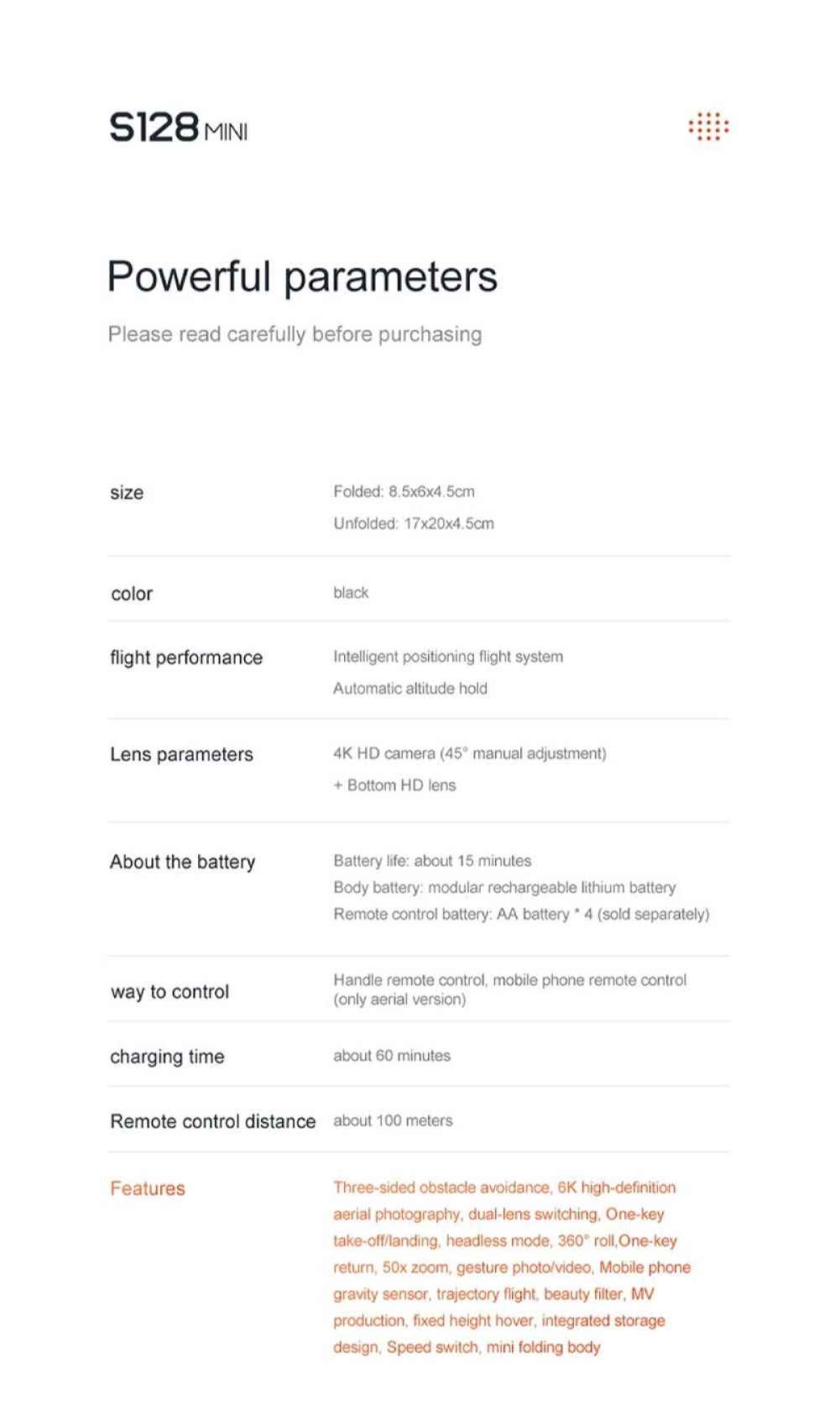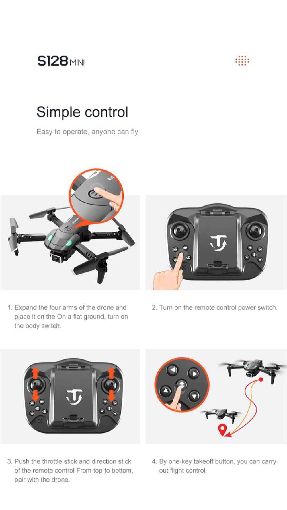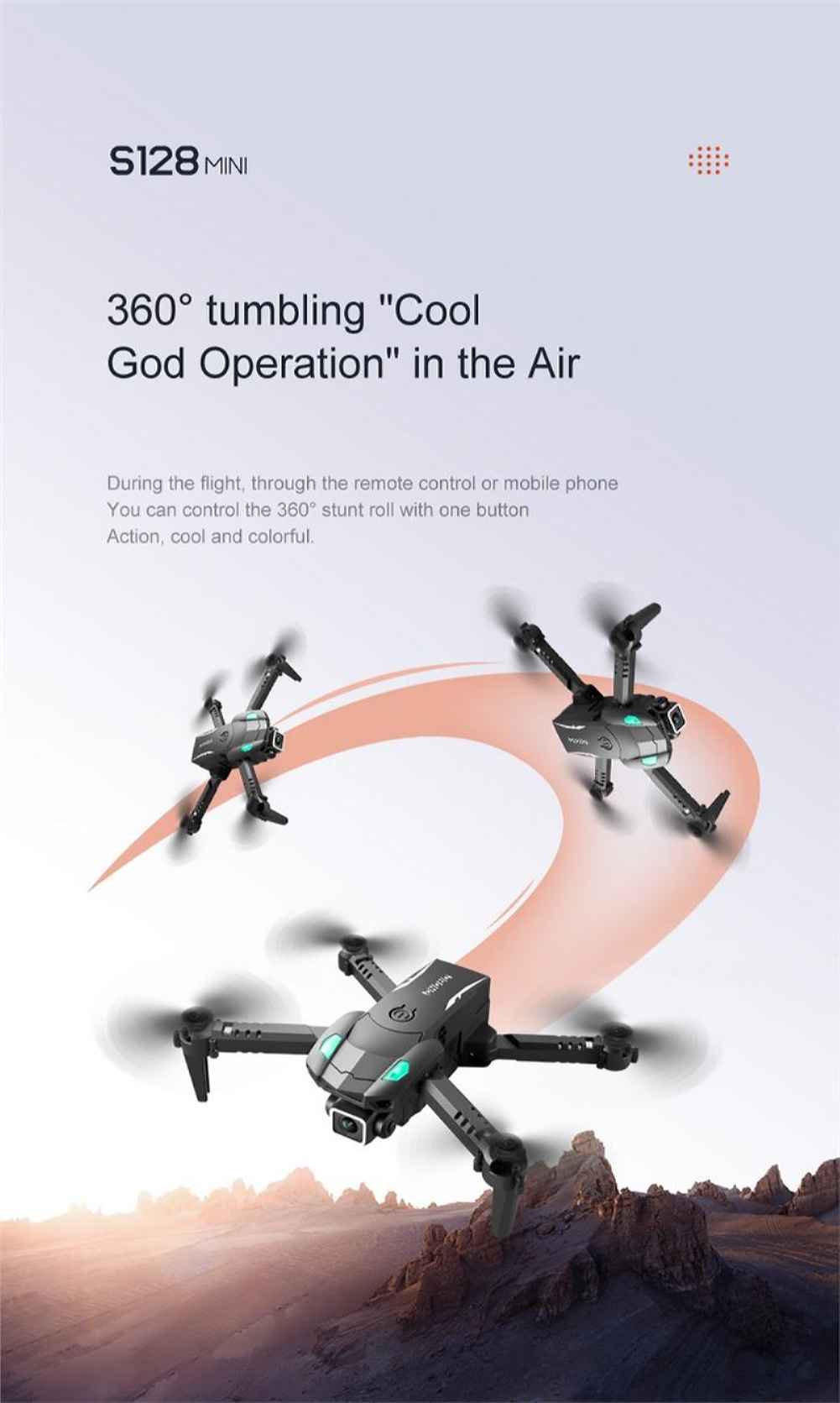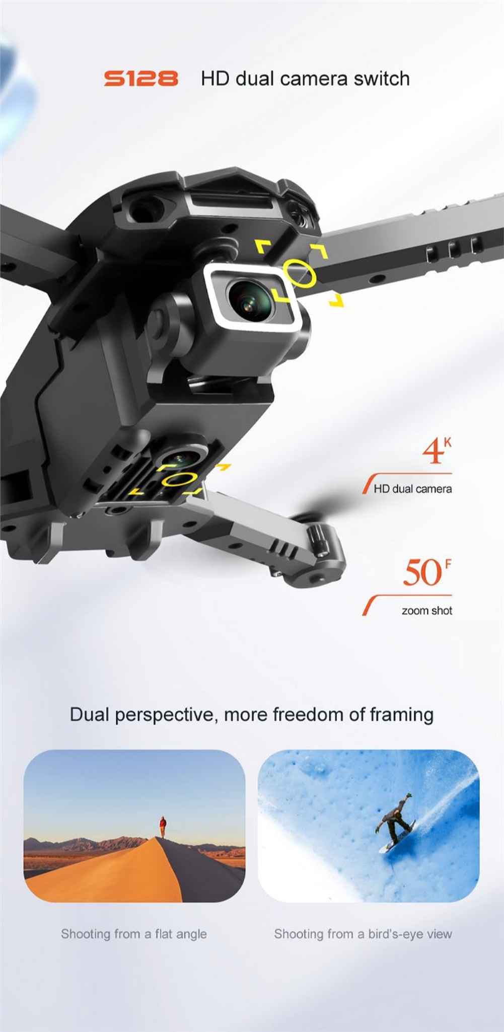 The S128 Mini WIFI FPV Drone is designed for both indoor and outdoor use, featuring a 4K HD dual camera for high-quality images. This foldable RC quadcopter offers three-sided obstacle avoidance and altitude hold for stable flight. With a headless mode and one-key return, it ensures easy control, even for beginners. The drone supports real-time image transmission, gesture shooting, and 3D flips, providing a versatile flying experience. Its manual adjustable camera and 50X zoom allow for detailed captures. Enjoy a flight time of about 10 minutes with a remote control distance of up to 150 meters.