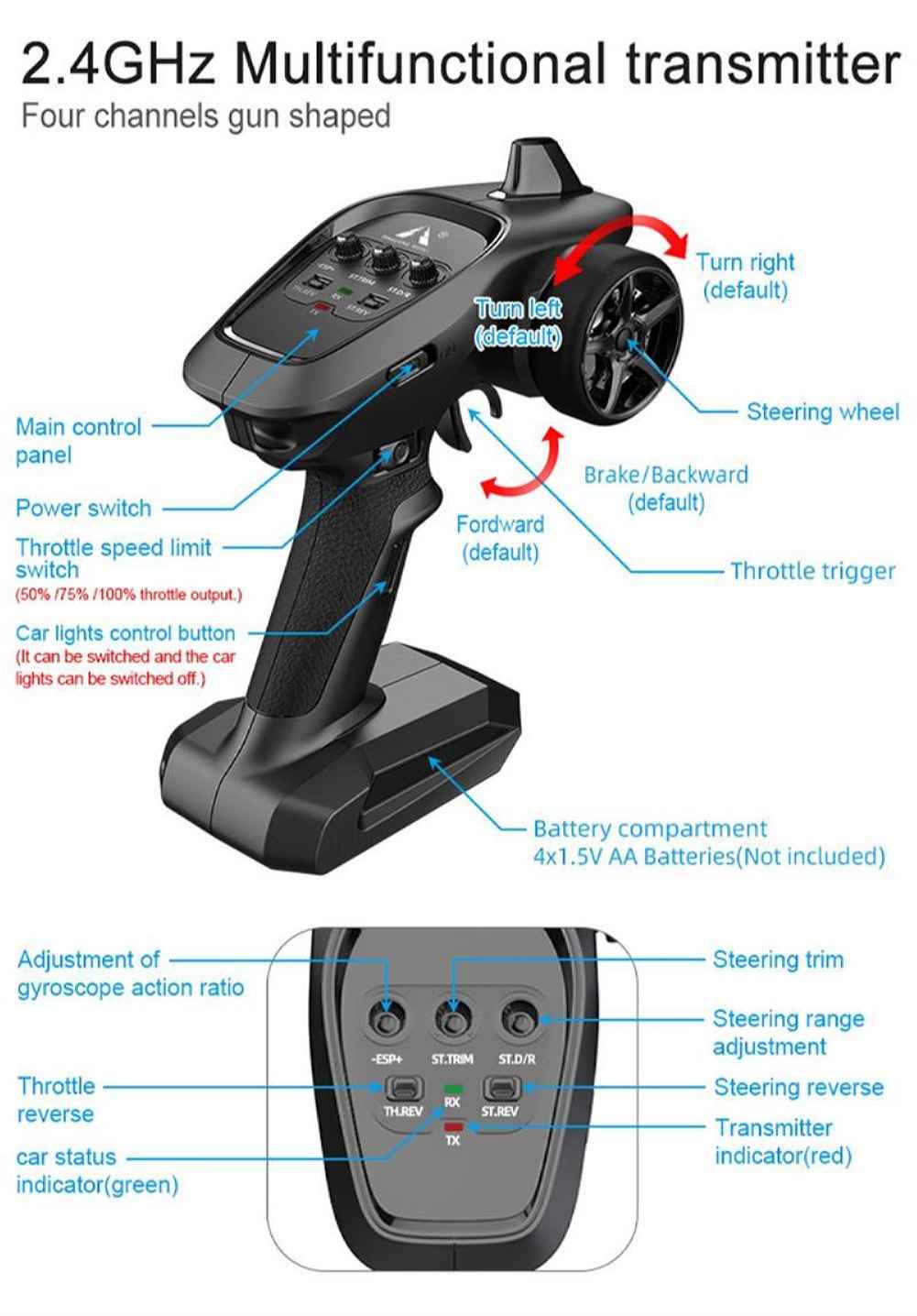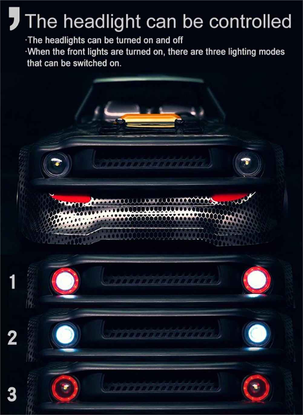 This model is equipped with full-scale synchronous control functions such as forward, backward, left and right turning, braking, LED light,proportional throttle and steering, as well as battery overcharge protection and overcurrent protection