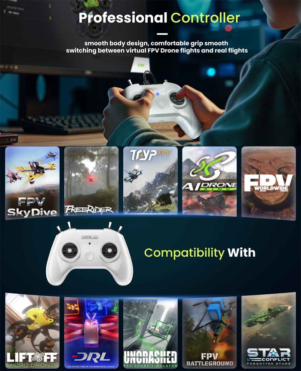 The STARTRC Drone S8 FPV Simulator Controller is a specia1ized tool designed for drone enthusiasts, particularly for FPV (First-Person View) drone pilots. It allows users to practice and refine their flying skills through simulation, providing a realistic experience that mirrors actual flight scenarios. Whether you’re a beginner learning the basics or an experienced pilot perfecting advanced maneuvers, this controller offers a seamless and immersive training experience.