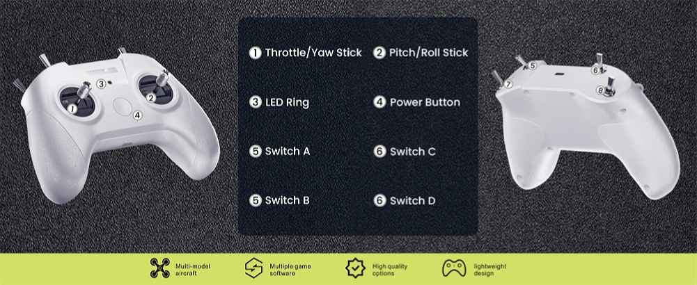 – Roll & Pitch Joystick (Right): Precise control over roll (right hand) and pitch (elevation)