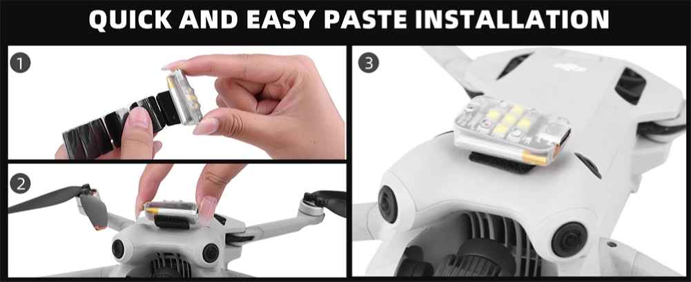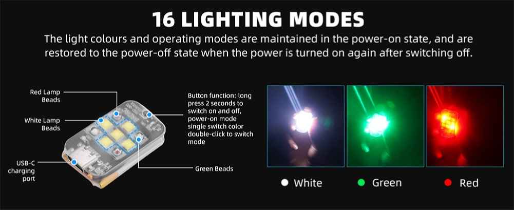 – MULTIPLE LIGHTING MODES:The drone strobe light is available in three colours: white, red and green. Total 16 light modes. Click to switch the colour, double click to switch the flashing mode, long bright 汪 fast flash 汪 slow flash 汪 alternate fast flash 汪 three-colour breathing cycle mode.With memory function.