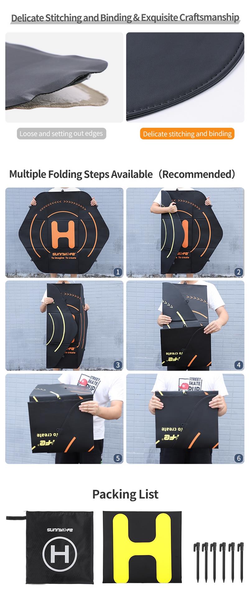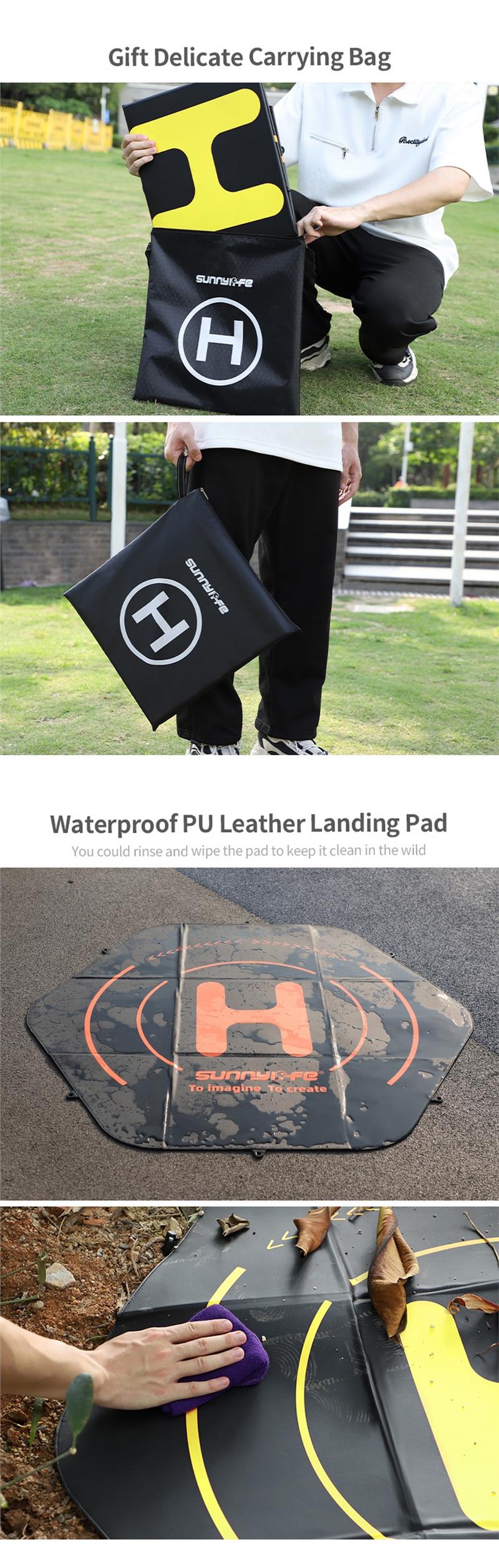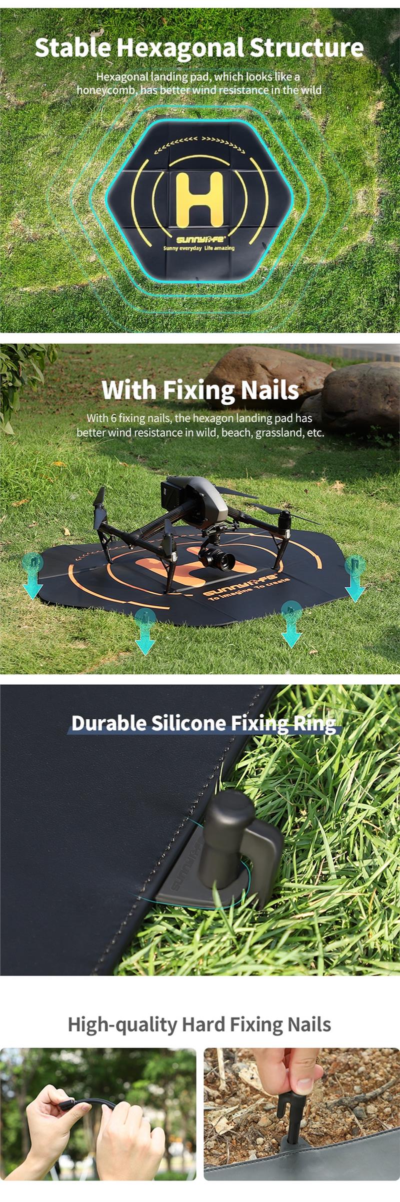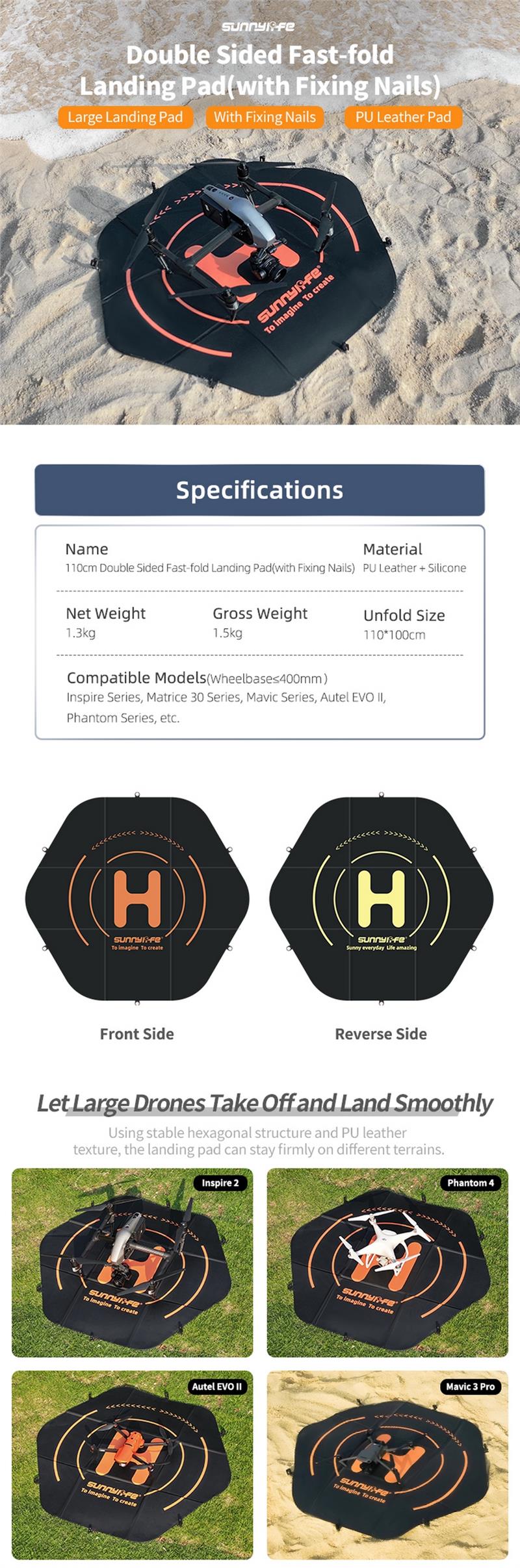 – Professional landing pad for large drones. 110cm large apron, hexagonal wind resistance, leather fabric to increase friction, more professional and more secure.- Fixed with ground nails, wind resistance. In wild environments such as beaches, grass, forests, etc., it has stronger wind resistance.- High-quality double-sided leather material: waterproof and wear-resistant, can be rinsed and wiped, and can be easily cleaned outdoors. Silicone fixing ring, durable and not deformed; high-quality nails, hard texture.- Comes with an exquisite portable storage bag, making it easy to travel outdoors.- Outdoor ink, bright color and not easy to fade. Tight sewing and hemming, exquisite workmanship.