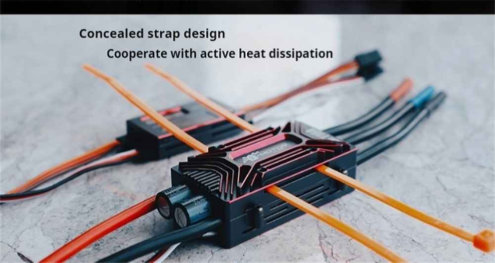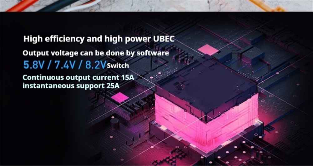 4. High-efficiency high-power UBEC, the output voltage can be switched between 5.8V / 7.4V / 8.2V through software, continuous output current 15A, instant support 25A
