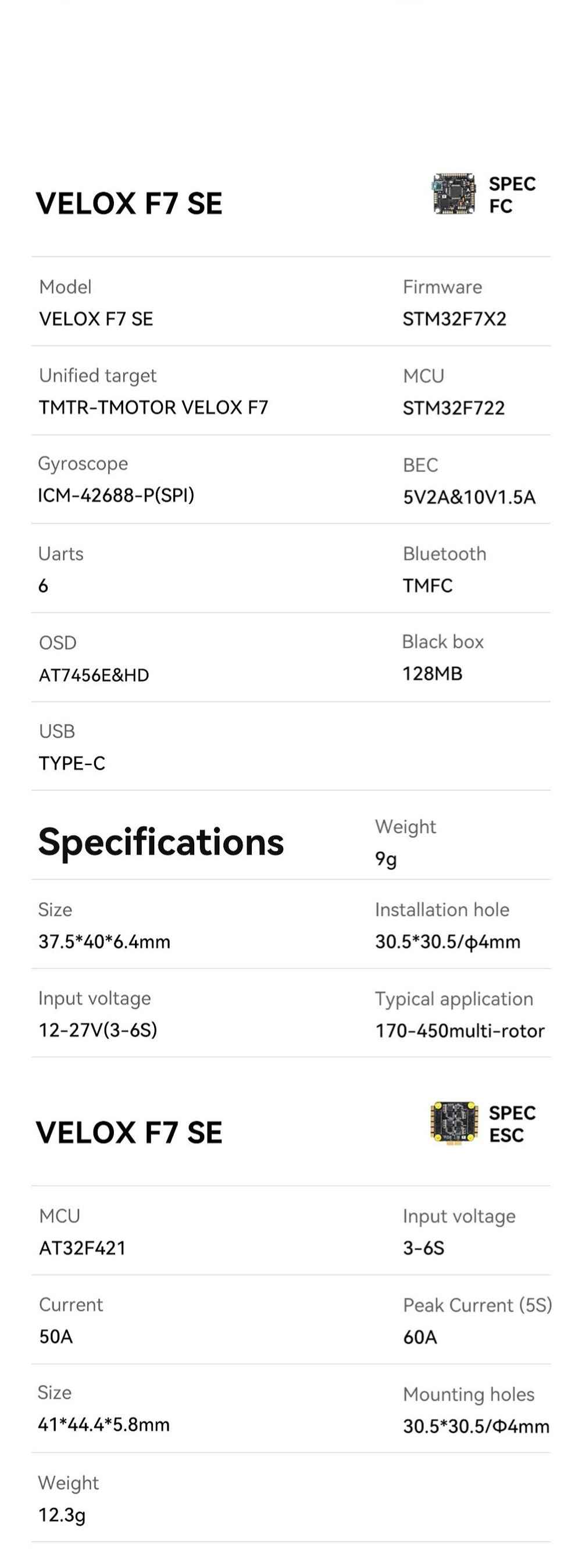 The F7 SE stack supports 8 motor outputs and can also be used on the X8 drone; it uses a 42688 gyroscope and is paired with firmware version 4.4.3 or higher to provide better stability. It is equipped with a 128 MB large-capacity black box chip, larger than the 16 MB black box of the regular F722. The F7 SE stack is equipped with T-Motor Velox motors, which can bring a more comfortable and stable flying experience. This stack is specially designed for the 5-inch X4 drone. When used with the TMOTOR Velox V3, it can take off and land 1000 times without damage.