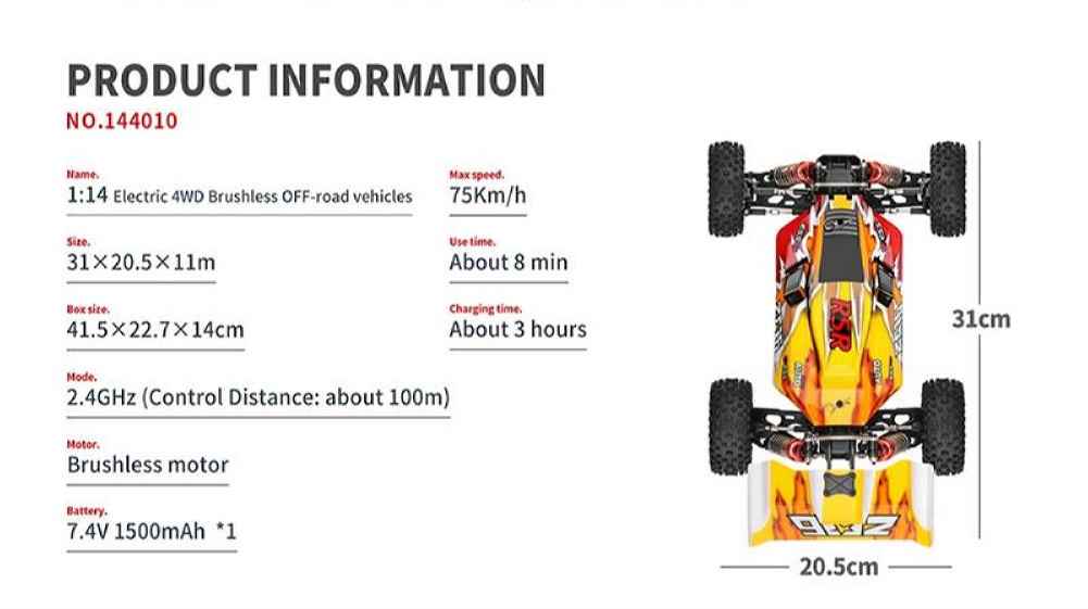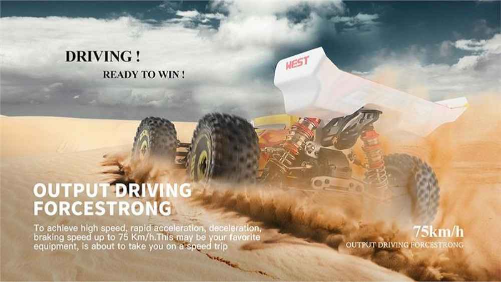 Experience the thrill of high-speed racing with the Wltoys 144010 Brushless RC Car. This 1/14 scale model boasts a powerful 2845 4300KV brushless motor, allowing it to reach speeds of up to 75km/h. The car features a durable high-strength aluminum alloy body and zinc alloy gears for enhanced stability and wear resistance. With a 2.4G frequency transmitter, enjoy precise proportional control over a 100-meter range. The package includes a USB charger for the built-in 7.4V 1500mAh battery, offering 8 minutes of run time after a 3-hour charge. Perfect for both beginners and experienced hobbyists, this RC car delivers an exhilarating driving experience.