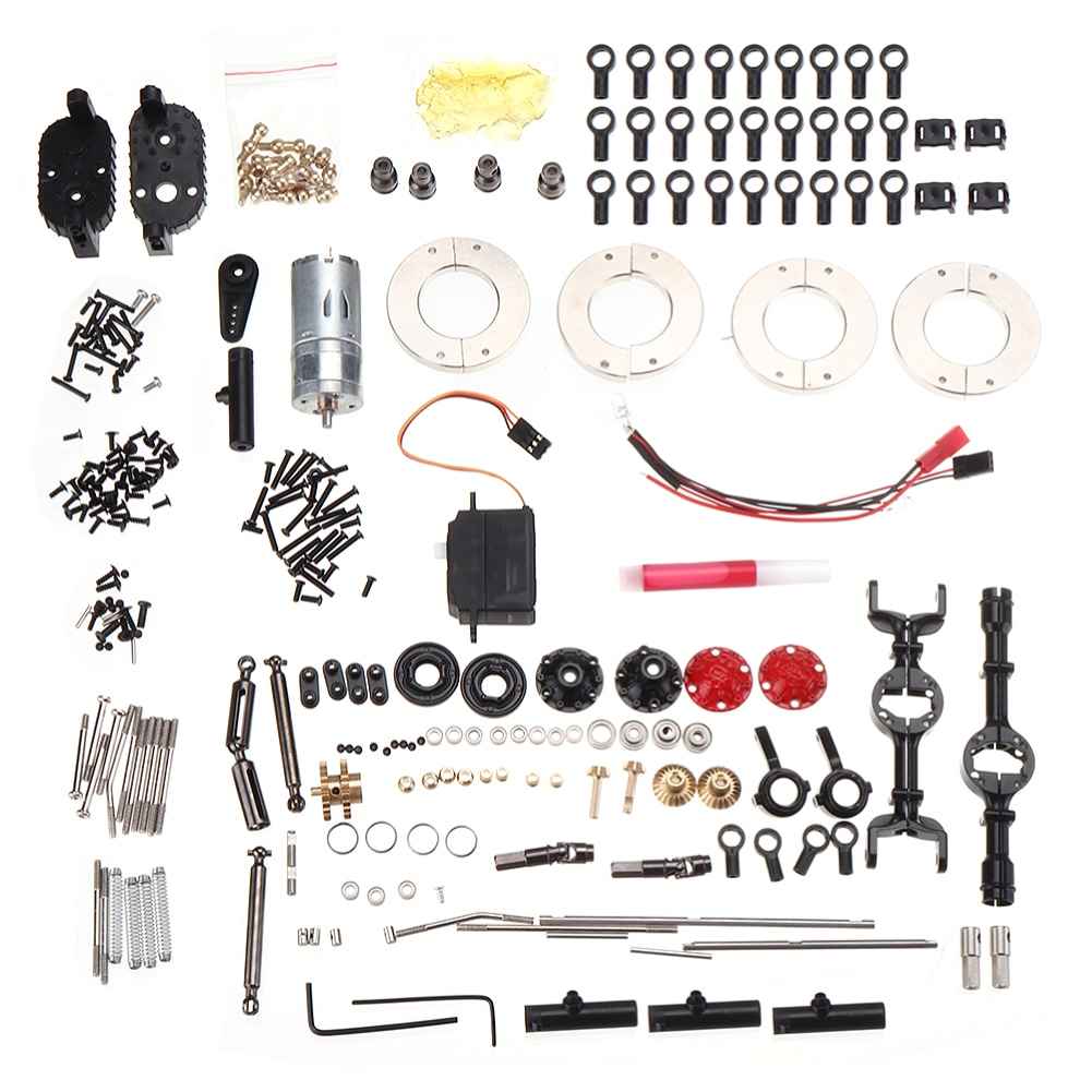 The WPL C34KM 1/16 Metal Edition Kit is a 4WD crawler RC car designed for off-road adventures. This DIY kit includes a 1:16 scale model featuring a robust metal 370 reverse transmission box, full metal front and rear axle housing, and a complete set of metal OP parts. The car is equipped with a 25g steering gear and soft tires for enhanced grip. With a full car ball bearing system and metal adjustable lever, this model promises improved performance. The kit includes a servo and motor, but requires additional components such as a transmitter and battery to complete the setup.