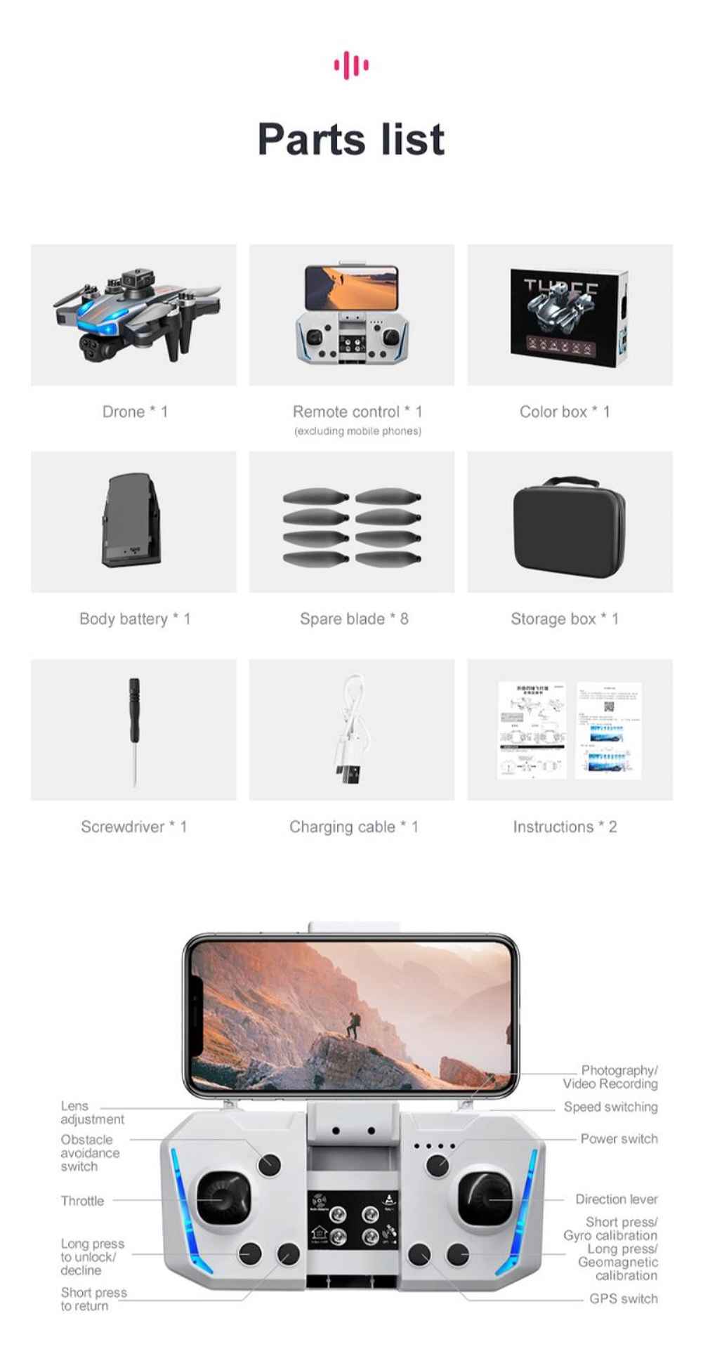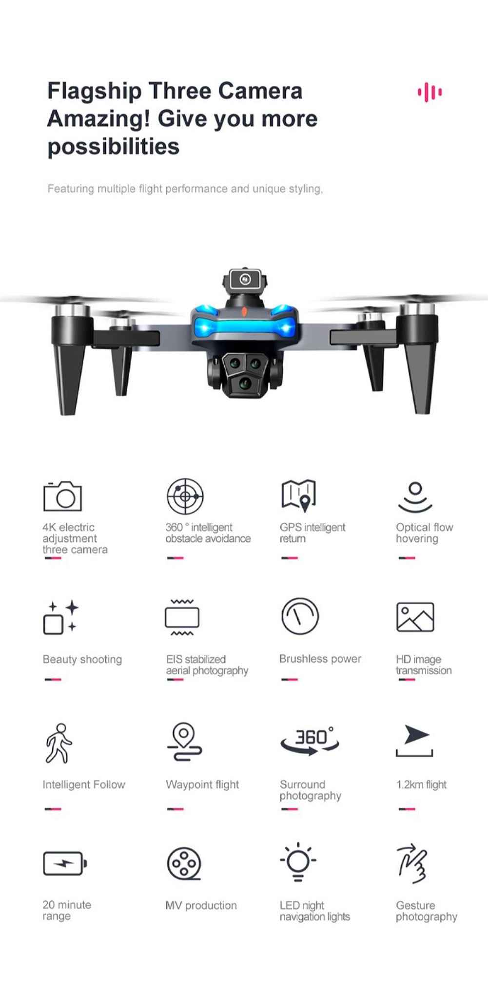 Function: up / down, front / back, left / right turn, lateral flight, three-level flight speed, around flight, waypoint flight, altitude hold mode, headless mode, one key return, one key take off and landing, WiFi FPV, Three Camera / video, Infrared Obstacle Avoidance, Brushless Motor, GPS Positioning, Optical Flow Positioning