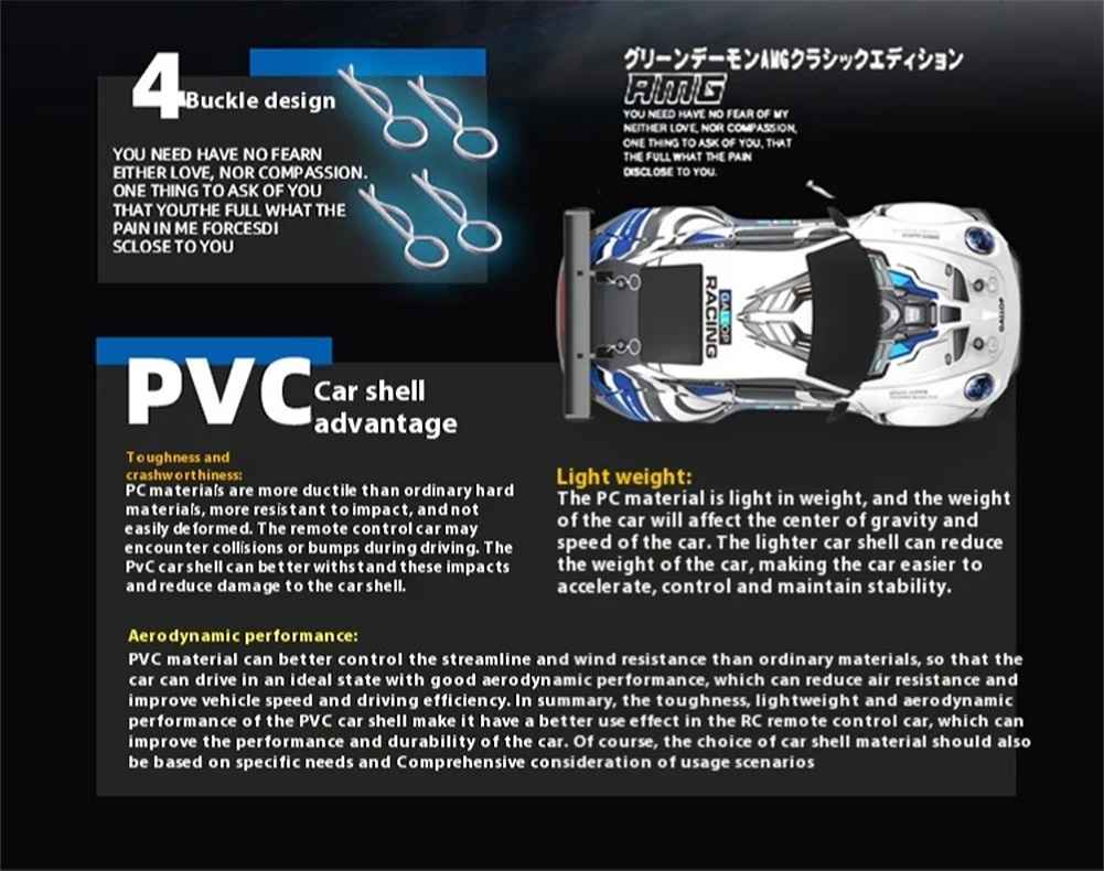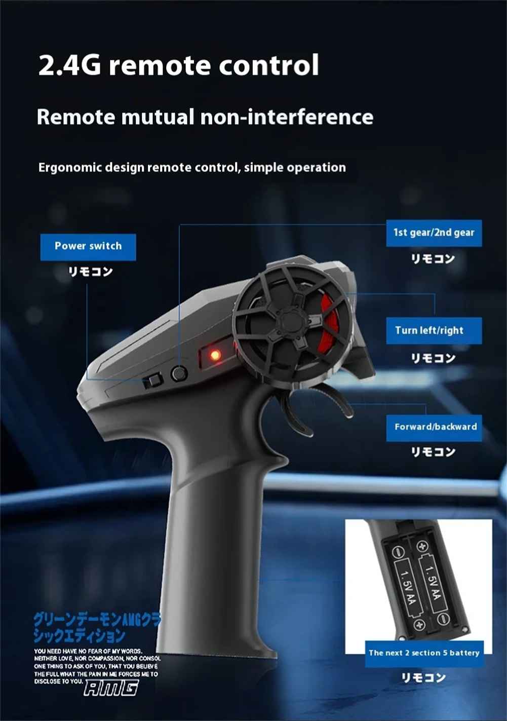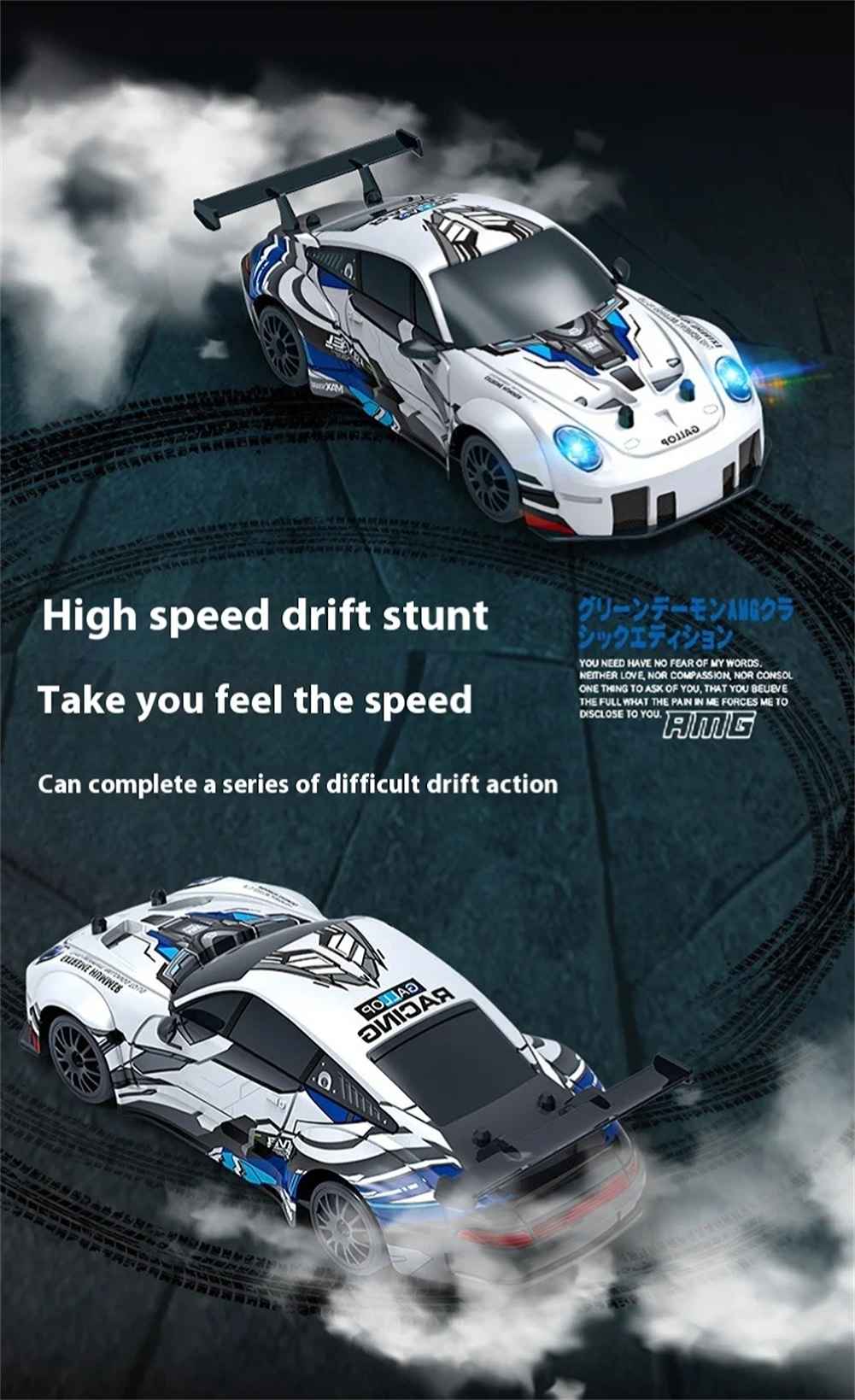 Forward, backward, left drift, right drift, 2-speed drift function, with front lights, 2-speed drift function